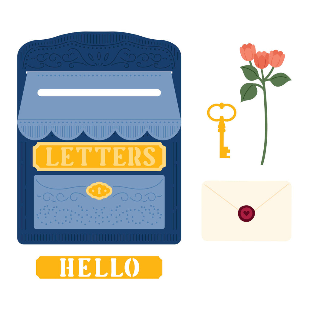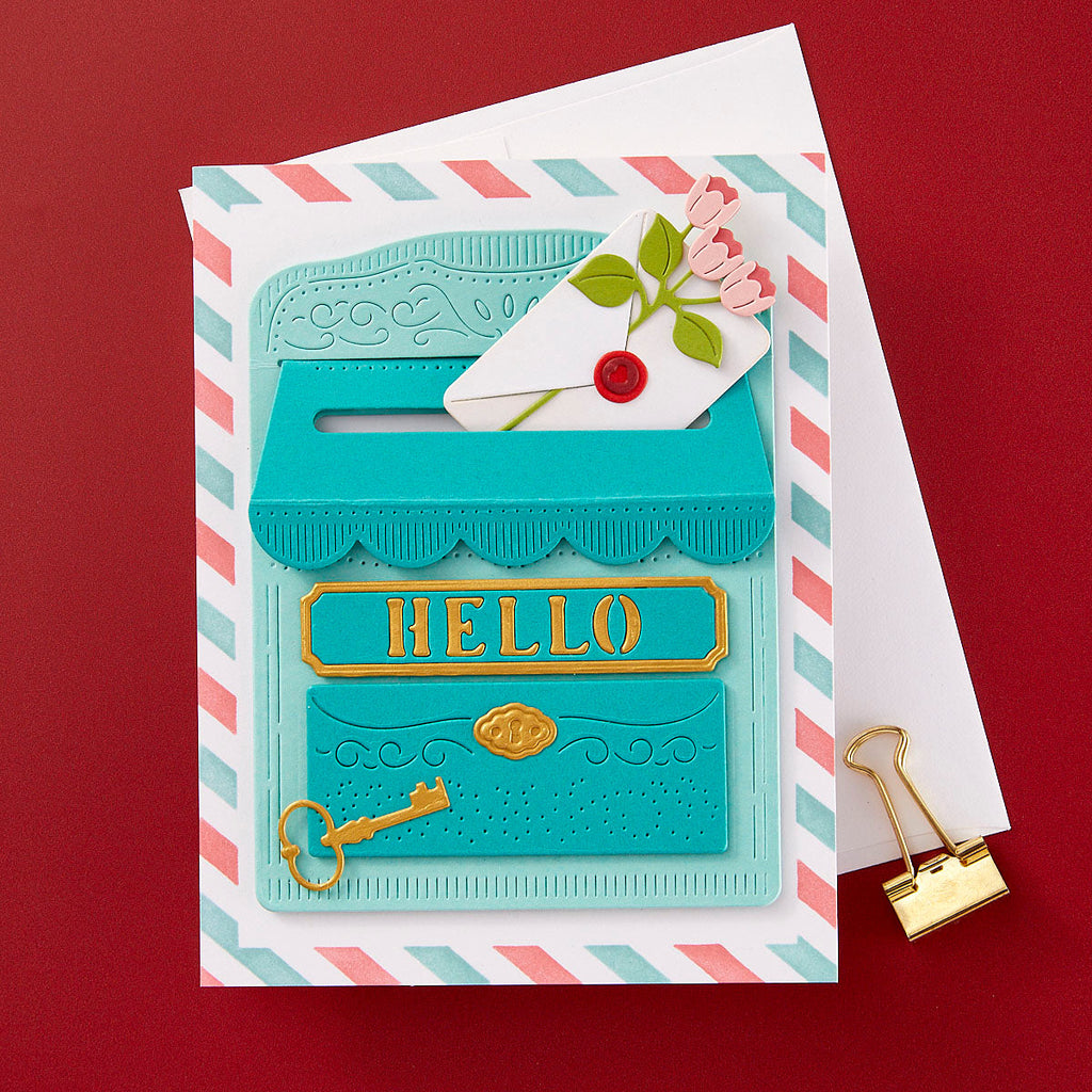 Lock & Key Mailbox – April 2025 Large Die of the Month Add vintage charm and heartfelt flair to your creations with the April 2025 Large Die of the Month: Lock & Key Mailbox. This elegant 14-piece die set builds a dimensional, old-fashioned mailbox complete with intricate details, a working mail slot, a decorative lock and key, and coordinating floral embellishments.