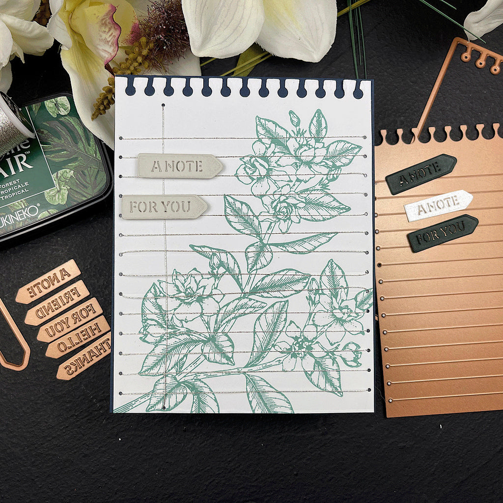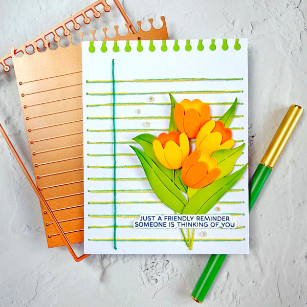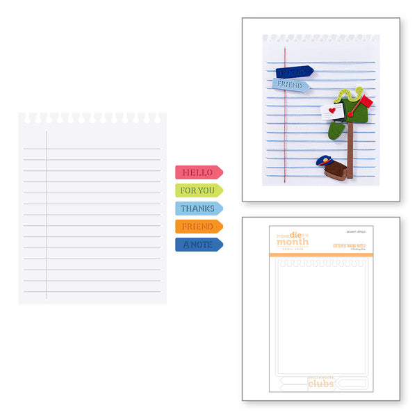 Stitched Taking Notes – April 2025 Stitching Die of the Month Add a charming hand-stitched flair to your paper projects with the April 2025 Stitching Die of the Month: Stitched Taking Notes. This clever 9-piece die set is designed to mimic a spiral-bound sheet of notebook paper, complete with stitching guide lines and notched edges for an authentic, whimsical touch.