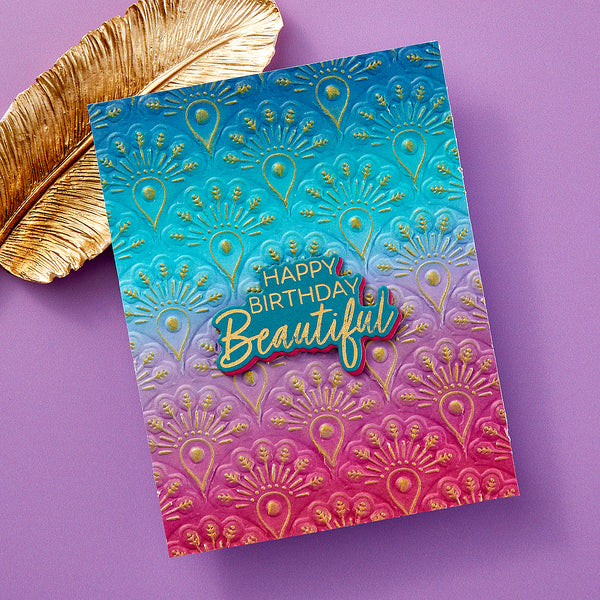 Peacock Motif 3D Embossing Folder is a 5.50 x 8.50-inch embossing folder with an amazing design that mimics a peacock bird in a repeat pattern. What a fabulous addition to mix and match with the other sets in this collection!