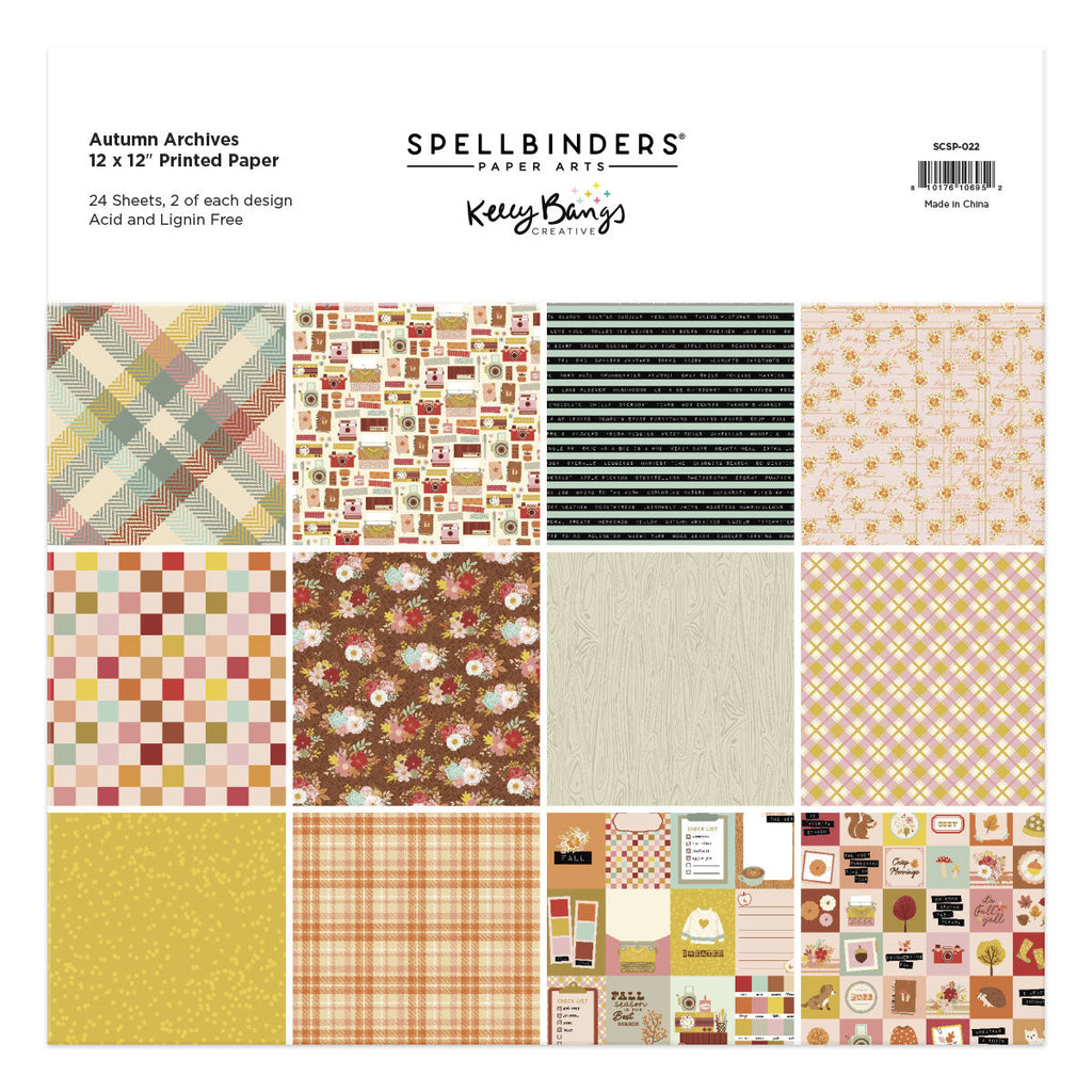 Autumn Archives 12 x 12" Paper Pack is a pack of 24 patterned paper sheets with two each of 12 designs. Autumn Archives Collection by Kelly Bangs is a season of sweater weather and cozy fall colors. A wonderful time to document those memories of warm gatherings and blessed moments!