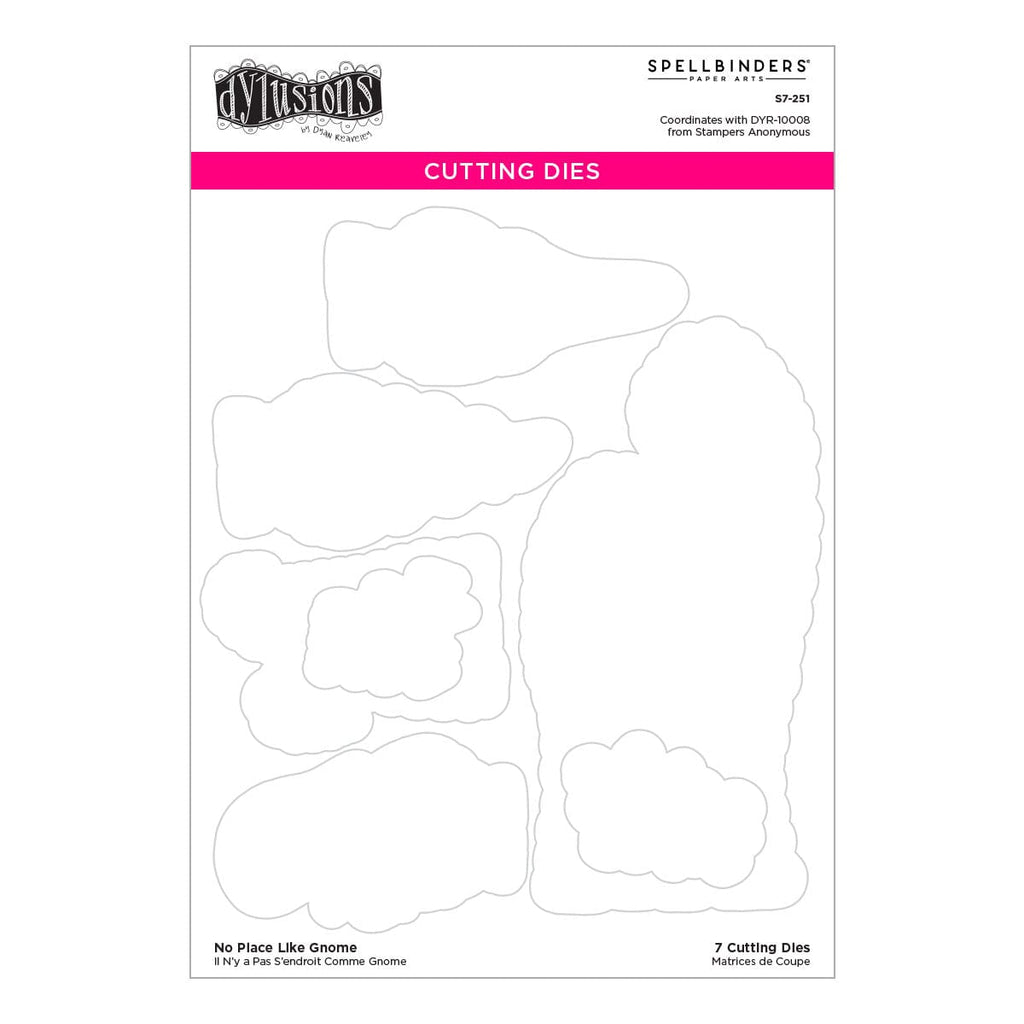 No Place Like Gnome Stamp and Die Bundle is from Stamps & Dies by Dyan Reaveley. It includes S7-251 No Place Like Gnome Etched Dies and DYR-10008 No Place Like Gnome Cling Stamps. Together, they creats a whimsical gathering of three gnomes and their love of hats! It even has two sizes of gnome trees for a unique backdrop. Use the cling stamps with an acrylic stamping block.