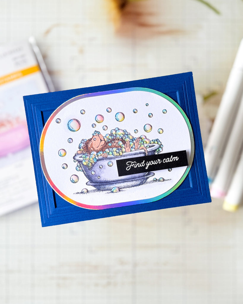 Spa Day Cling Stamp Set is part of the House-Mouse Party Parade Collection. Mudpie is enjoying a spa day with a tub full of overflowing bubbles and floating bubbles all around. In addition to the focal image, the set of six stamps includes a bubble and two-bubble cluster designs, along with three sentiments: 'Find your calm', 'Relax…', and Pamper yourself – you deserve it!' Designed to be used with an acrylic block.