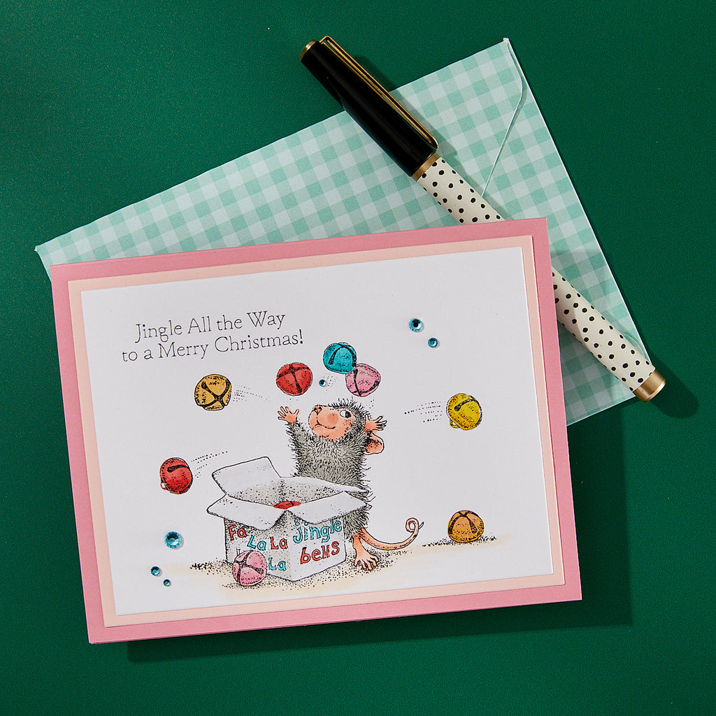 Jingle Bell Wishes Cling Rubber Stamp Set is from the House-Mouse Tree-mendous Christmas Collection. Maxwell is ringing in some holiday cheer with a box full of jingle bells! In addition to the focal point image, the set of four stamps includes three sentiments: Jingle All the Way to a Merry Christmas, May your Holiday Ring with Joy and Laugher!, and Sending you Jingle Bell Wishes and Festive Cheer! Designed to be used with a stamp acrylic block. The House-Mouse Designs® is created and copyrighted by the talented Ellen Jareckie. It is a wonderful collaboration with Spellbinders, and we are excited to share a warm and cozy holiday series of designs with the Tree-mendous Christmas Collection!