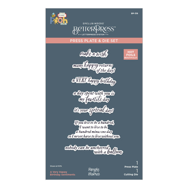 A Very Happy Birthday Sentiments Press Plate & Die Set is part of the Say Cheese Classic Pooh Birthday Collection. The one plate presses seven cheerful birthday sentiments all at once. Then, you can cut all of them out in one pass through your die cutting machine with the matching thin metal cutting die. What a time-saving step! Each phrase has a classic Pooh feel, perfect for creating that lovely nostalgic feel while sending birthday wishes. Use with BP-320 Celebration Moments to create sweet scenes with everyone's favorite Hundred Acre Wood Friends. Ink the plates with the BetterPress Ink to be pressed against the BetterPress Cotton Card Panel and Sheets for a crisp letterpress design.