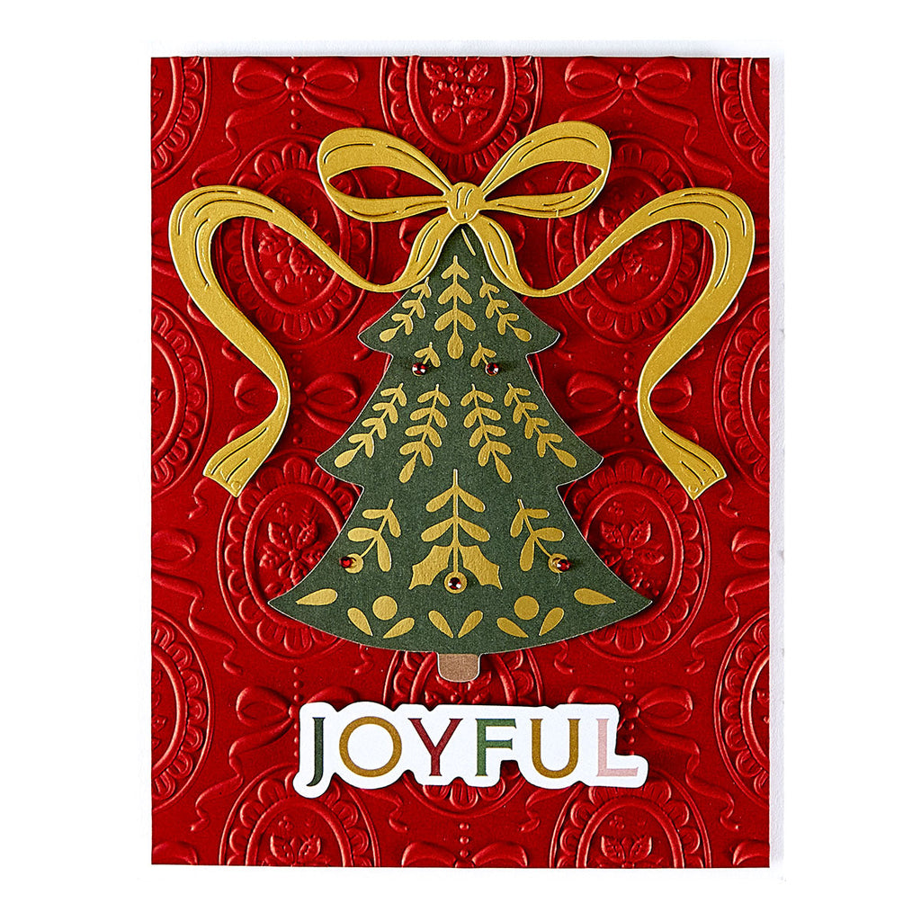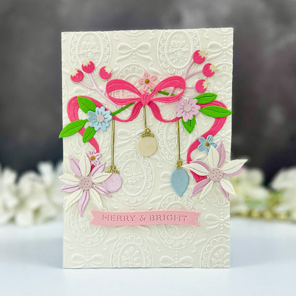 Christmas Cameos 3D Embossing Folder is a 5.50 x 8.50-inch embossing folder filled with a detailed pattern of scalloped oval frames with pointsettias in the center. Each cameo is suspended by a lovely bow. Combine with the Merry Moments Annual Holiday Mega Kit for maximum crafty possibilities!