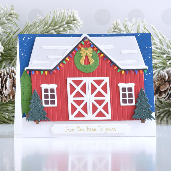Country Christmas Barn Etched Dies are from the Country Christmas Collection by Annie Williams. Build a barn with this set of 17 thin metal cutting dies! Includes everything to dress it up for the holidays too: wreath, two sizes of trees, and holiday lights! After the holidays, take the décor off or make another one for all year round!