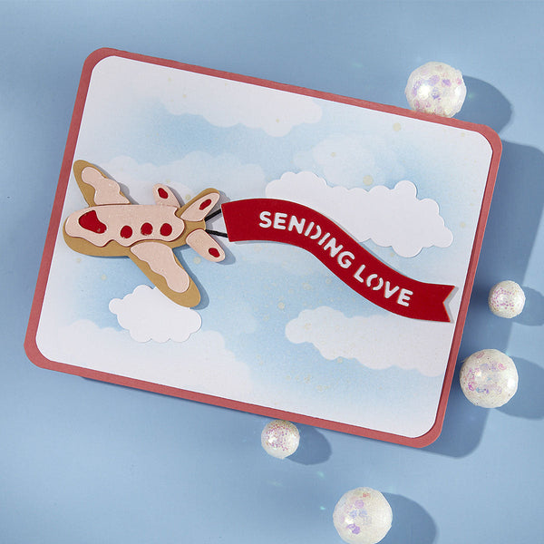 The Gingerbread Plane and Banners Etched Dies by Stamperia make for a playful way to send love and holiday greetings. This set of thirteen thin metal dies come together to create a delicious cookie plane covered in frosting, complete with a sentiment banner to trail behind. Three sentiments are included, “Sweet Christmas,” “Happy Holidays” and “Sending Love.” Complete the scene with fluffy candy clouds for a truly sweet card!