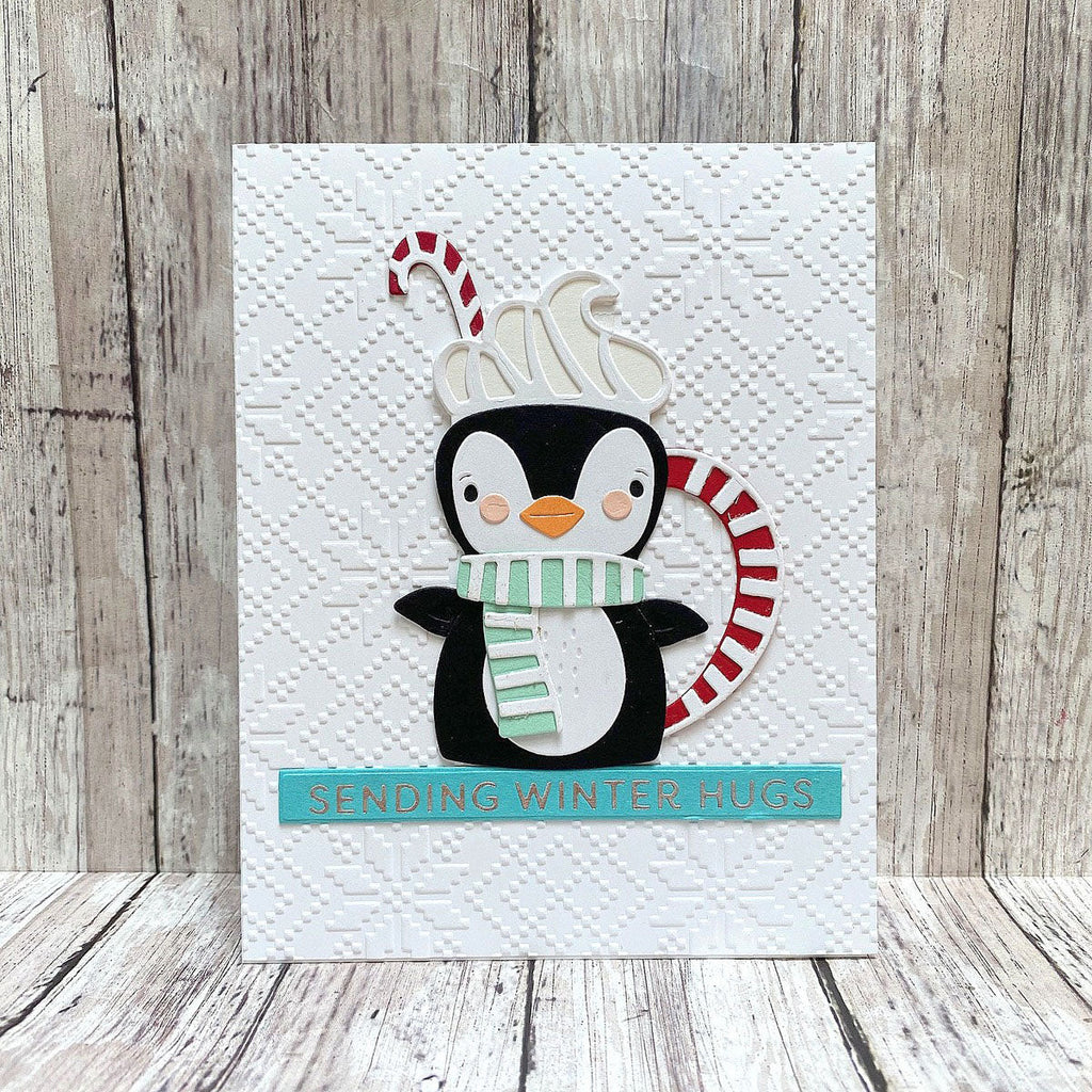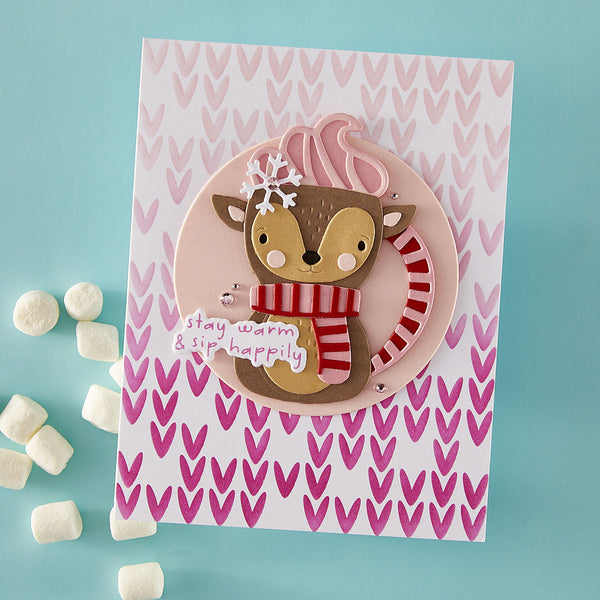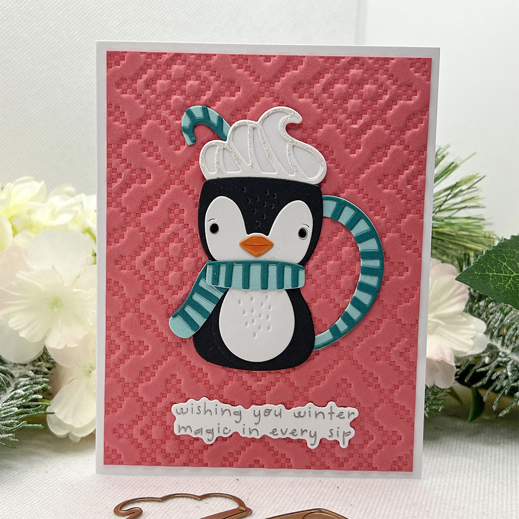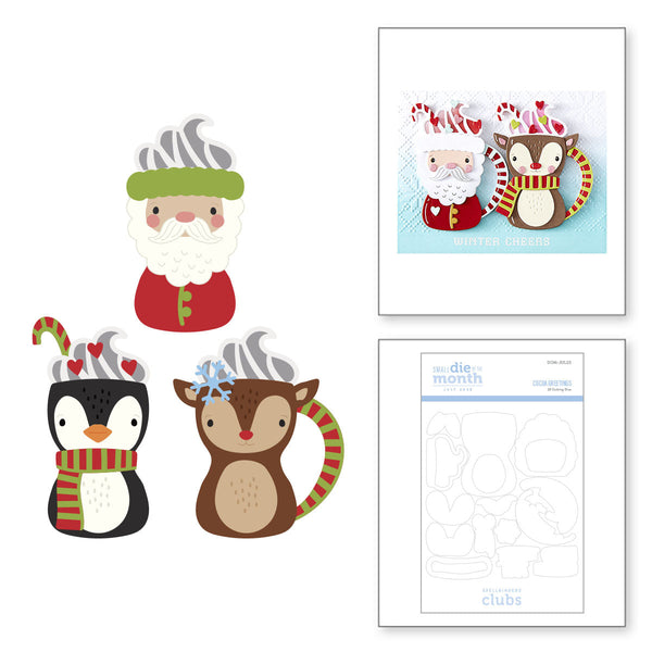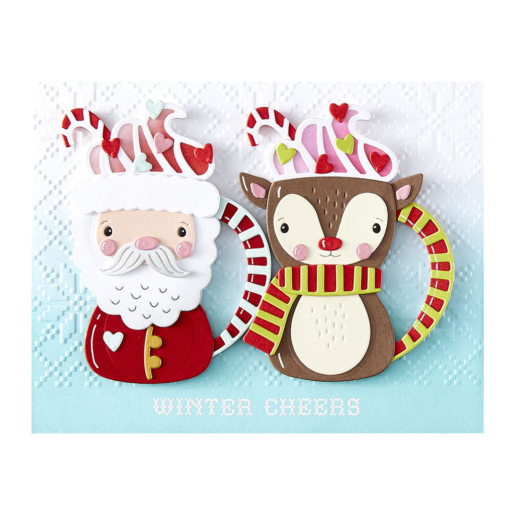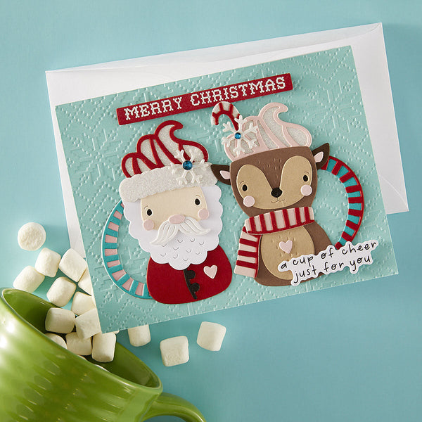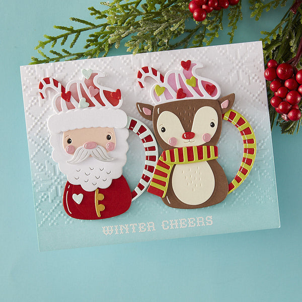Warm up your die-cutting with Cocoa Greetings, a whimsical set that turns Santa, a reindeer, and their penguin pal into charming cocoa mugs! These 18 mix-and-match dies bring the sweetest winter sips to life—with swirls of whipped cream, candy cane handles, and cozy scarf details that add extra cheer to your holiday makes.