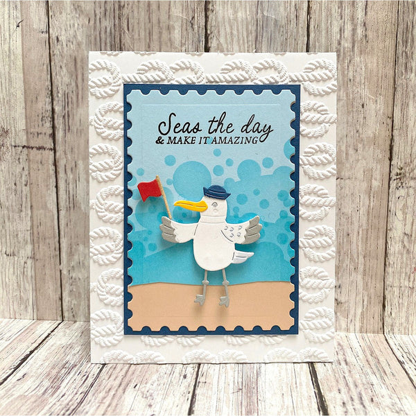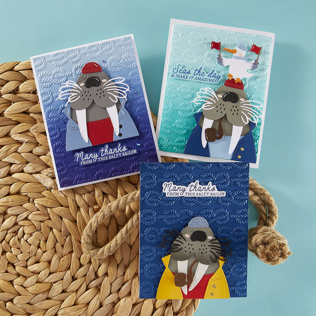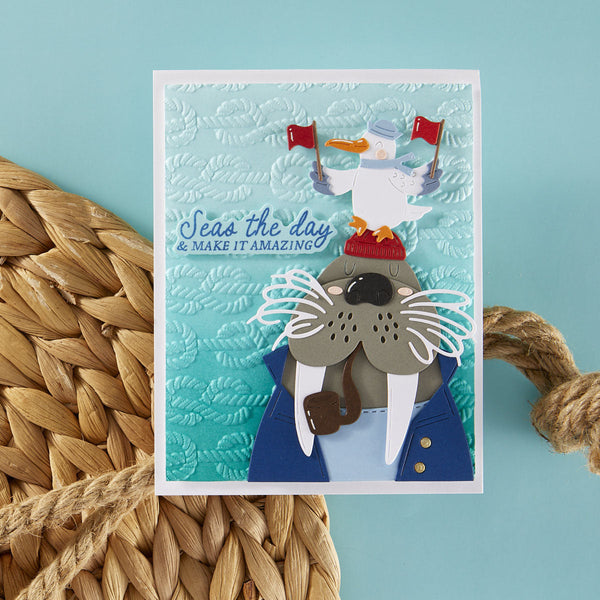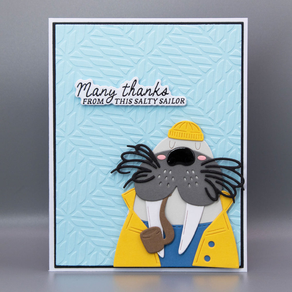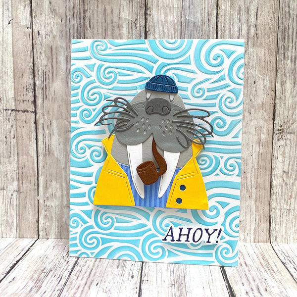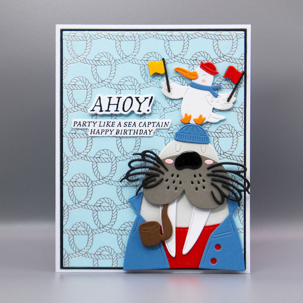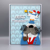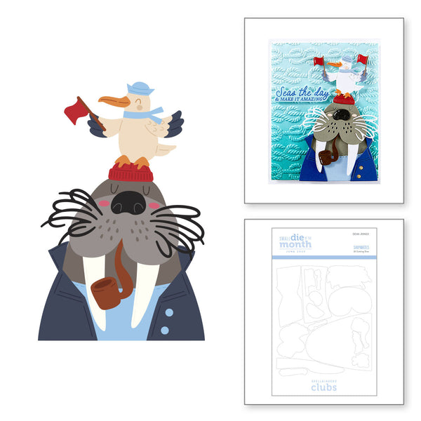 Shipmates - June 2025 Small Die of the Month Set sail for smiles with the “Shipmates” Small Die of the Month! This delightful die set features a wise old walrus in a nautical coat and cap, complete with tusks, a pipe, and his trusty seagull friend perched up top waving signal flags.