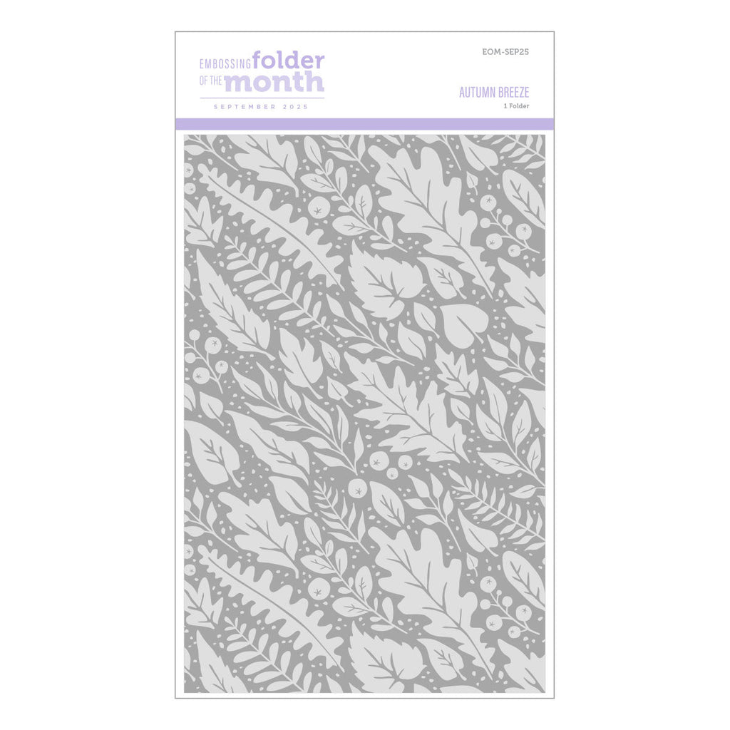 Let the beauty of fall sweep across your projects with the Autumn Breeze Embossing Folder of the Month. This elegant all-over design features a swirling mix of oak, maple, and fern leaves intertwined with delicate berries and branches, capturing the effortless movement of an autumn day.