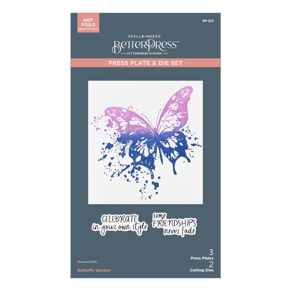 Butterfly Splatter BetterPress Plate & Die Set is part of the Beautifully Imperfect Collection. Impress a large and wonderful butterfly design with all its paint splatters... without any mess! The other two plates press sentiments athat can be cut out with coordinating dies to make them stand out. Ink the plates with the BetterPress Ink to be pressed against the BetterPress Cotton Card Panel and Sheets for a crisp letterpress design.