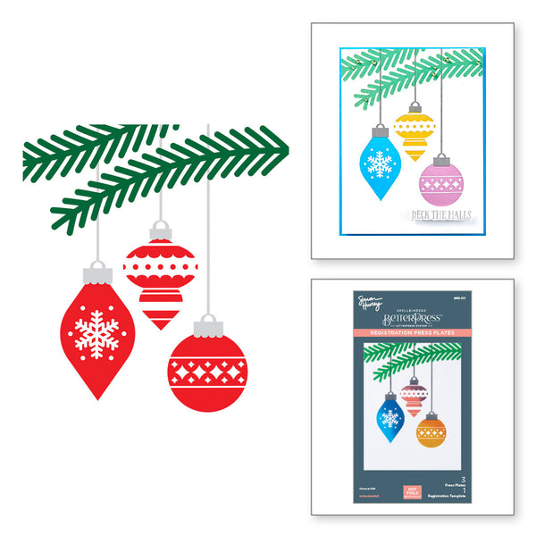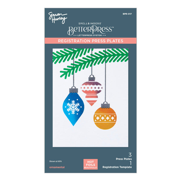 Ornamental Press Plates is part of the Glad Tidings Collection by Simon Hurley. This set of three press plates comes with a registration template to help align your projects for a perfect Christmassy scene. With three retro style ornaments and the strings and branches to hang them from, this set makes a stunning card in just a few minutes! Try inking the three ornaments in different colors for an extra pop... or use in your Glimmer machine to add a little sparkle to the project. Ink the plates with the BetterPress Ink to be pressed against the BetterPress Cotton Card Panel and Sheets for a crisp letterpress design.