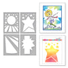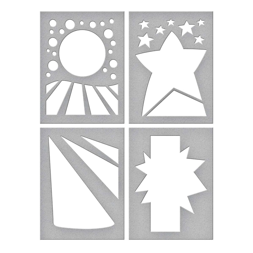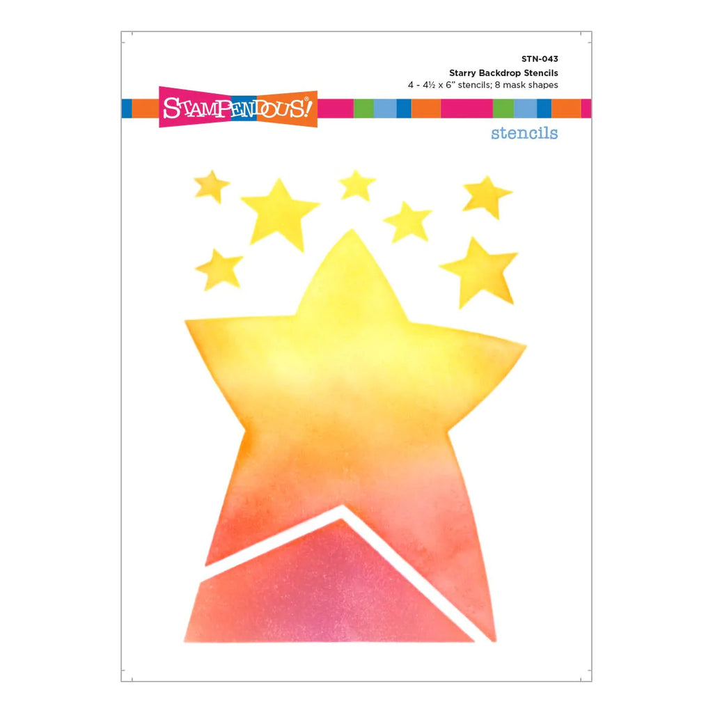 Stampendous Starry Backdrop Stencils come in a set of four 4.5 x 6 in mylar stencil sheets and eight mask shapes. Make colorful, stenciled backdrops for A2 size cards. Use masks to block off areas in the stencil or as a separate mask. Match with many of Stampendous’ clear stamp set to create an out of this world scene!