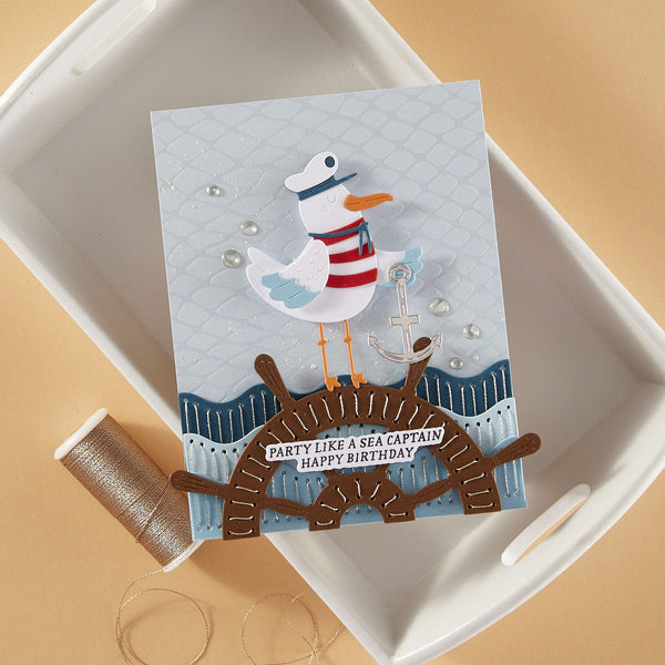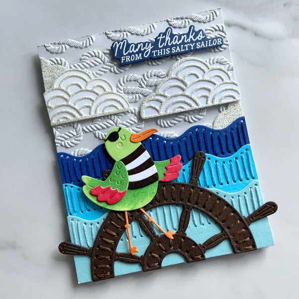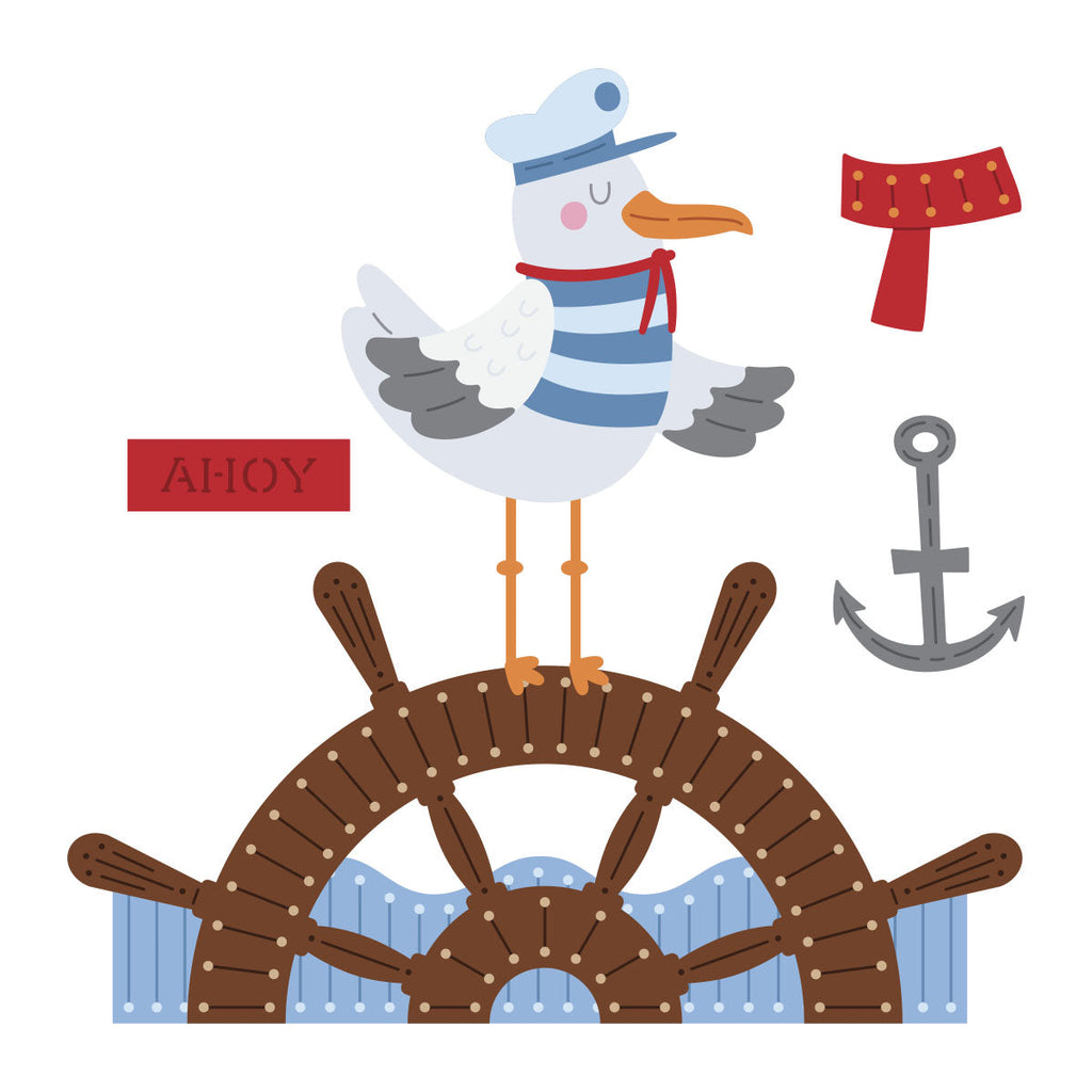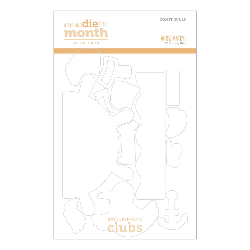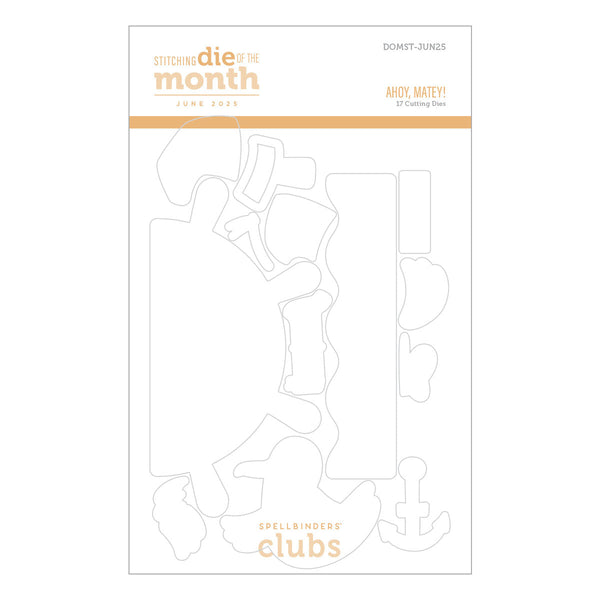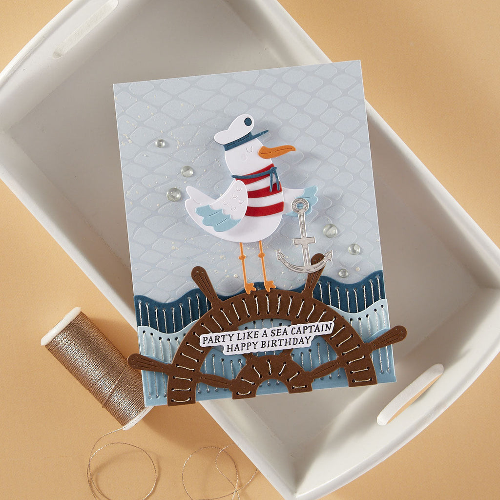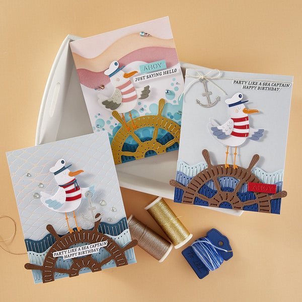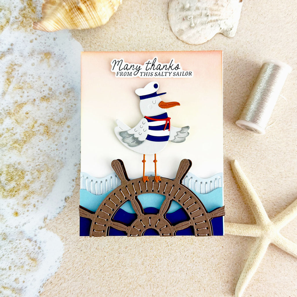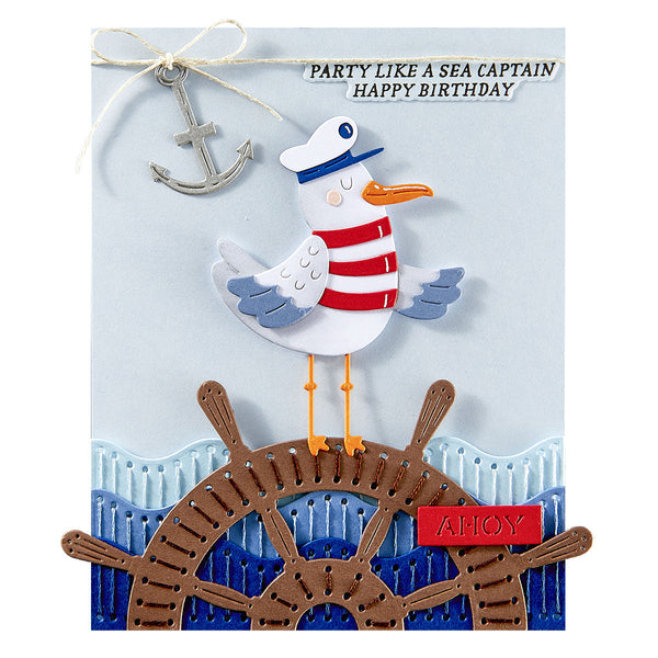 Ahoy Matey! – June 2025 Small Die of the Month - Bring nautical fun to your projects with the “Ahoy Matey!” Small Die of the Month! This playful die set features a dapper sailor seagull, a classic ship’s wheel, anchor, nautical flags, and the cheerful sentiment “AHOY”—perfect for sunny, sea-inspired scenes.