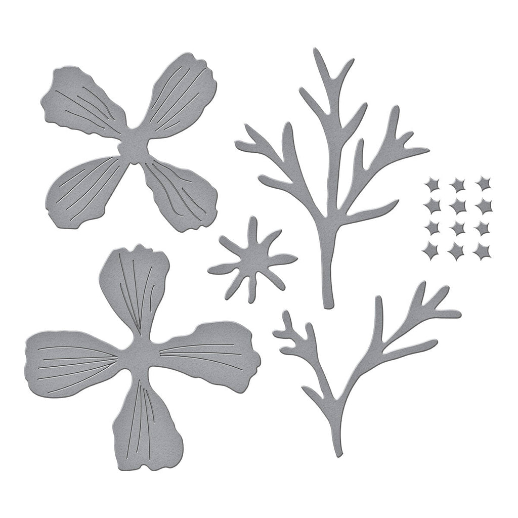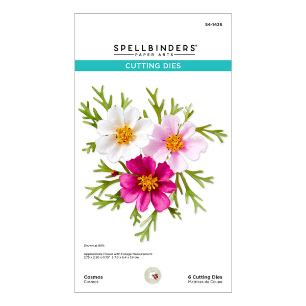 Cosmos Etched Dies are from the Summer Solstice Garden Collection by Susan Tierney-Cockburn. Assembled, this set of six thin metal cutting dies makes an adorable Cosmos flower. The finished flower with foliage measures approximately 2.75 x 2.50 x 0.75 in./7.00 x 6.40 x 1.90 cm.