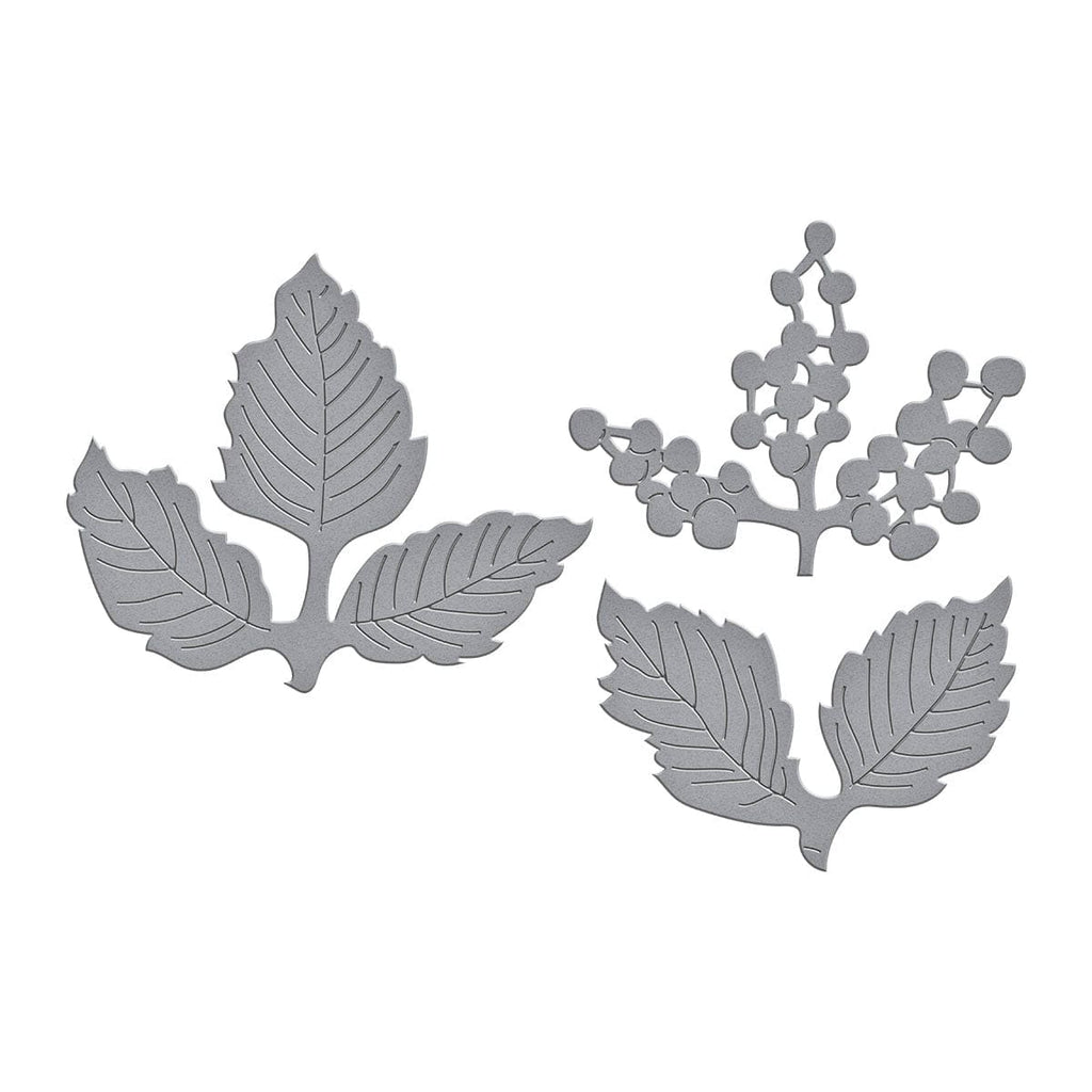 Withered Viburnum Etched Dies are part of the Winter's Grace Garden Collection by Susan Tierney-Cockburn. This set of three thin metal cutting dies creates foliage and berries on a stem. Make many to create a dense shrub design or use them as accents on a flowering bloom. Approximate Finished Stem with Foliage and Berries measures 0.50 x 3.00 x 3.00 in./1.30 x 7.60 x 7.60 cm.