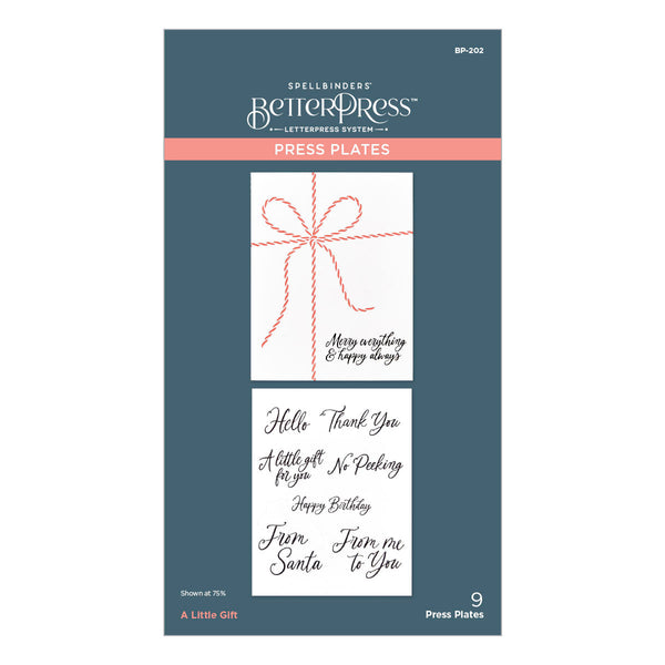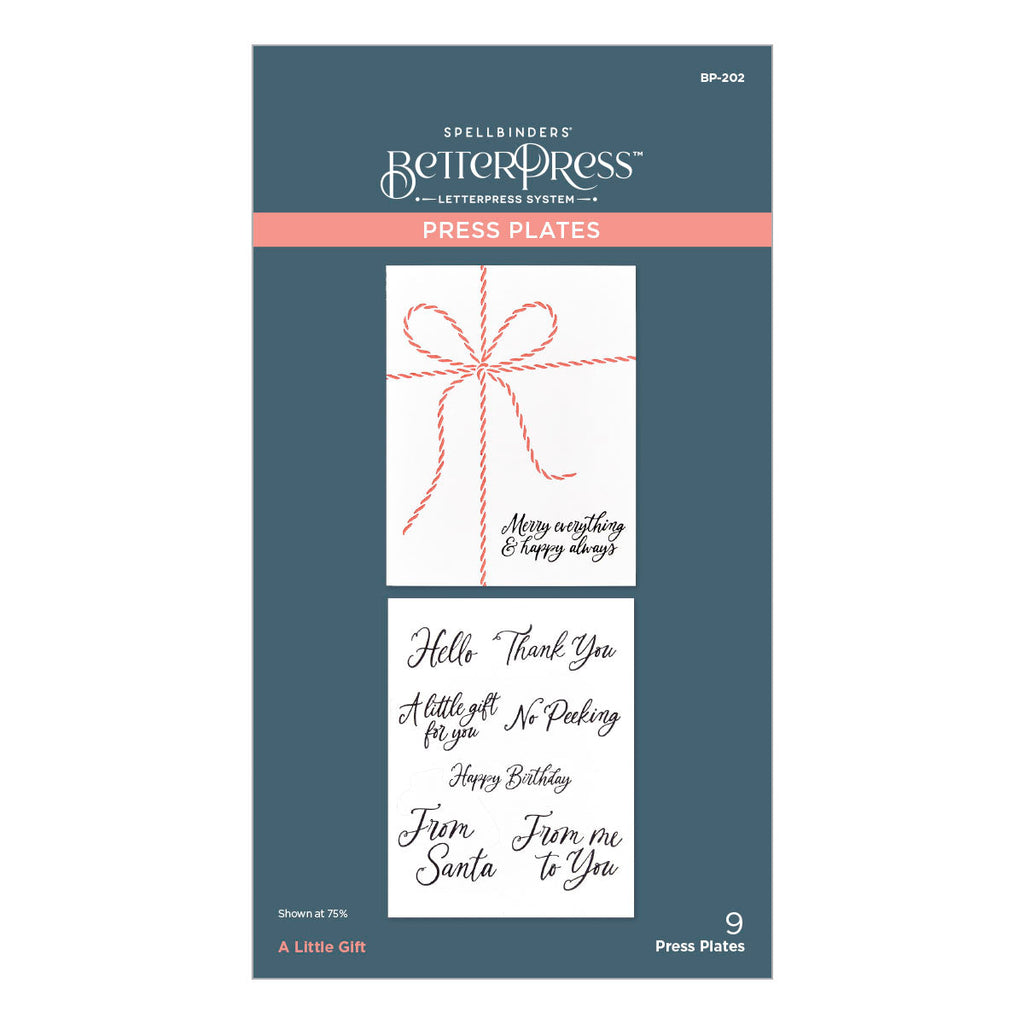 A Little Gift Press Plate is part of the Dancin' Christmas Friends Collection. This wonderful set of nine press plates can gift wrap any A2 size card front with a sweet twine bow. There is a choice of eight handwritten sentiment choices to finish it off. Ink the plates with the BetterPress Ink to be pressed against the BetterPress Cotton Card Panel and Sheets for a crisp letterpress design. Only four easy steps for professional results! Place the BetterPress Press Plate onto the Chase (magnetic platform to hold the press plate). Next, tape Card Panel on the Platen (clear top plate with registration marks). Apply Ink onto Press Plate. Make Letterpress Sandwich and run through the manual die-cutting machine. Change the way you create with BetterPress, an innovative way to achieve the elegant look of letterpress without all the mess. It’s an easy-to-use system that produces professional stationery style with detailed impressions that can be felt to the touch. Combine BetterPress with the Glimmer Hot Foil System, the Sealed with Spellbinders wax seal program, and the extensive library of Spellbinders products to create one-of-a-kind cards, stationery, projects and more. The BetterPress System works with your manual die-cutting machine to create beautiful, effortless, and detailed letterpress effects.