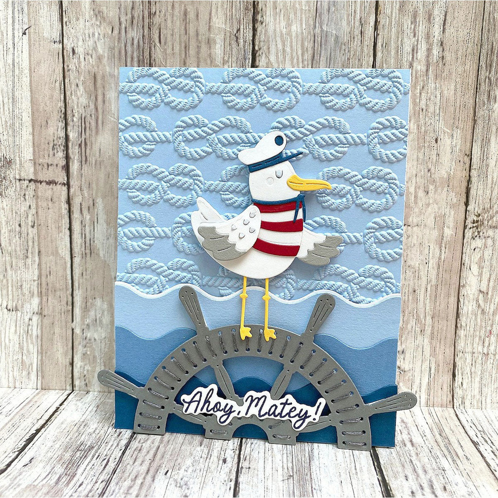 Ahoy Matey! – June 2025 Small Die of the Month - Bring nautical fun to your projects with the “Ahoy Matey!” Small Die of the Month! This playful die set features a dapper sailor seagull, a classic ship’s wheel, anchor, nautical flags, and the cheerful sentiment “AHOY”—perfect for sunny, sea-inspired scenes.
