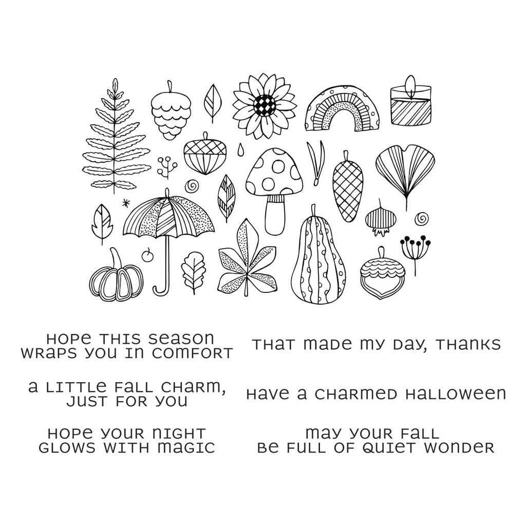 Capture the charm of the changing season with the Autumn Whim Clear Stamp of the Month. This delightful set features a playful mix of fall iconsmushrooms, pumpkins, leaves, acorns, and morealongside a cozy umbrella, candle, and rainbow for a touch of whimsy. Six coordinating sentiments make it easy to create cards full of gratitude, warmth, and a hint of seasonal magic.