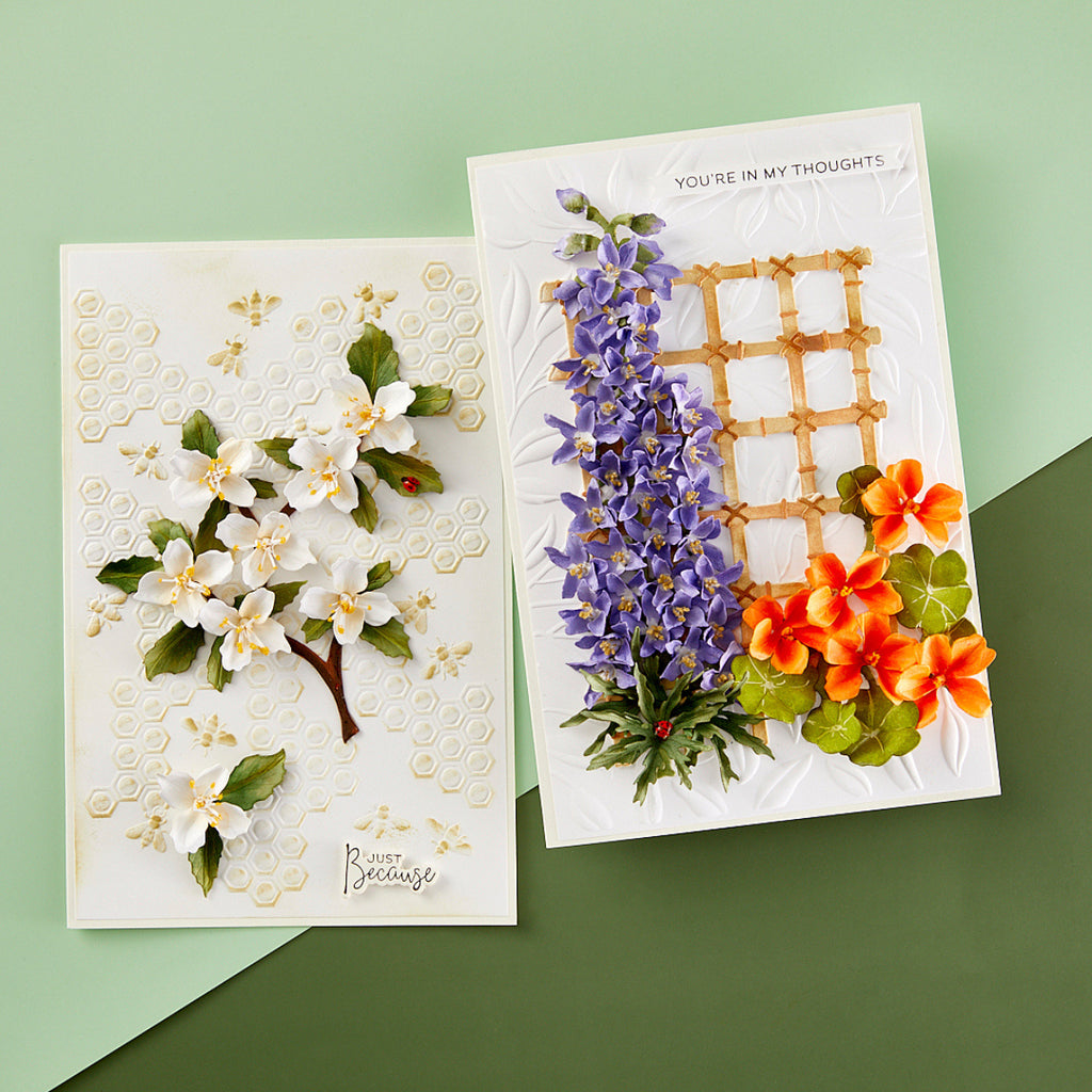 Bee-Cause 3D Embossing Folder is a 5.50 x 8.50-inch embossing folder that has randomly placed honeycomb designs on the folder with bees accented around the motif. A unique background for any garden-themed projects.