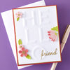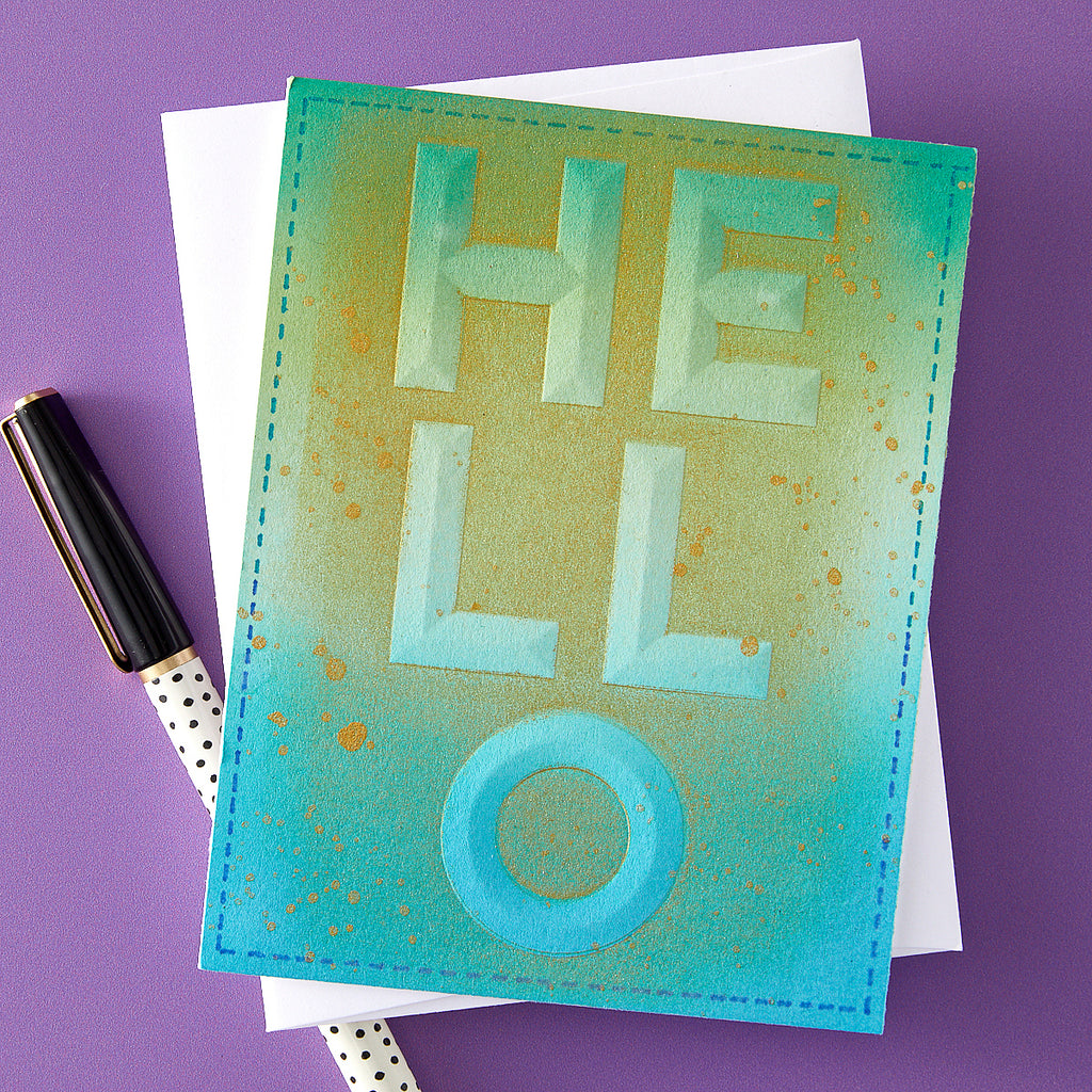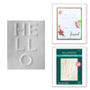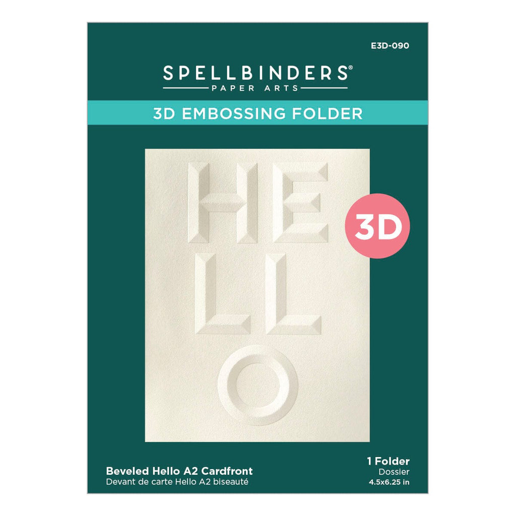 Beveled Hello A2 Cardfront 3D Embossing Folder is part of the Beveled Sentiment A2 Cardfronts Collection. It embosses a stunning uppercase Hello sentiment in a cutting-edge bevel design that adds even more depth. Emboss once, place on an A2 size card base and done! Perfect to emboss on an inked panel with paint spatters for a mixed media effect.