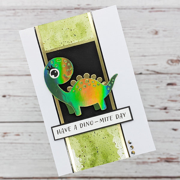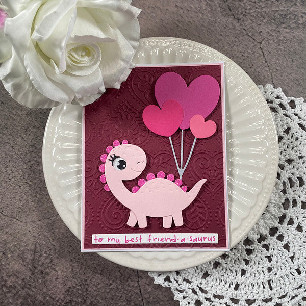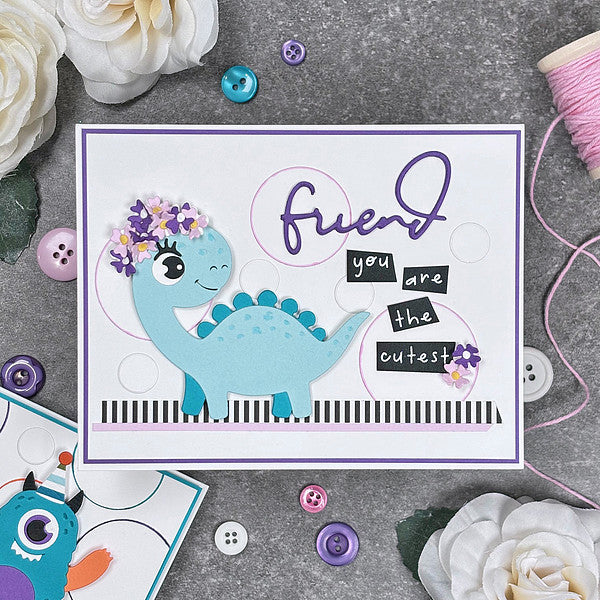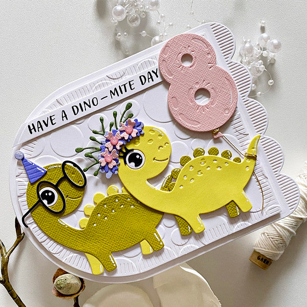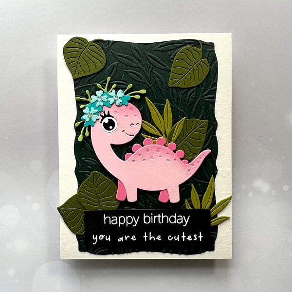 Dancin’ Birthday Dinosaur Etched Dies is part of the Monster Birthday Collection. Assembled the set of six thin metal cutting dies creates a side profile sweet Dinosaur. Unlike the other creatures, this one is stands stationary. Finished Dinosaur measures 2.92 x 2.44 in./7.40 x 6.20 cm.