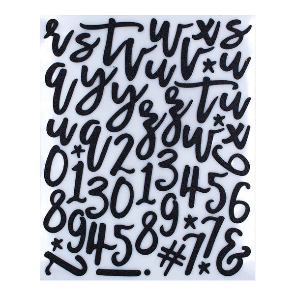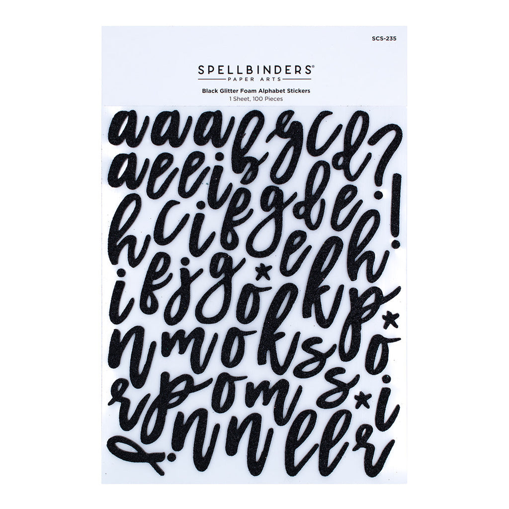 Black Glitter Foam Alphabet Stickers is part of the Santa Lane Collection. The glittering foam sticker letters will add dimension to your projects. 100 piece set features lower case hand-letters and select puntuation symbols (*?!.)