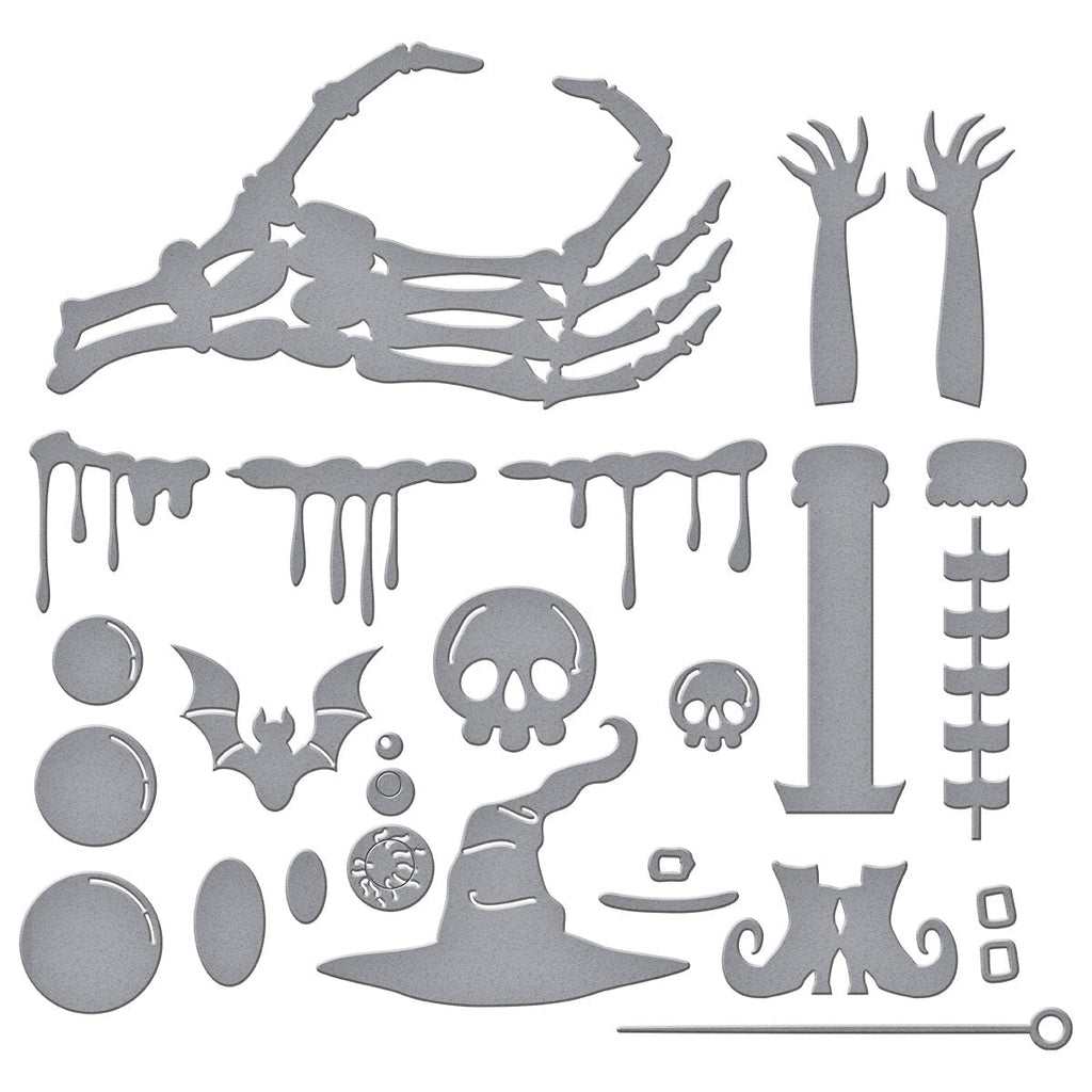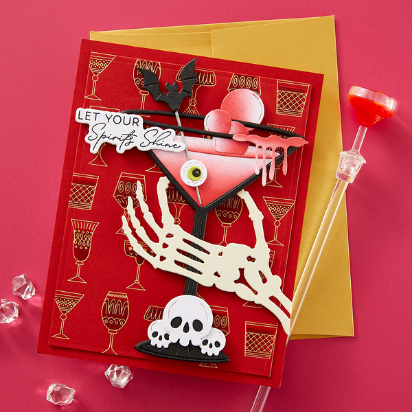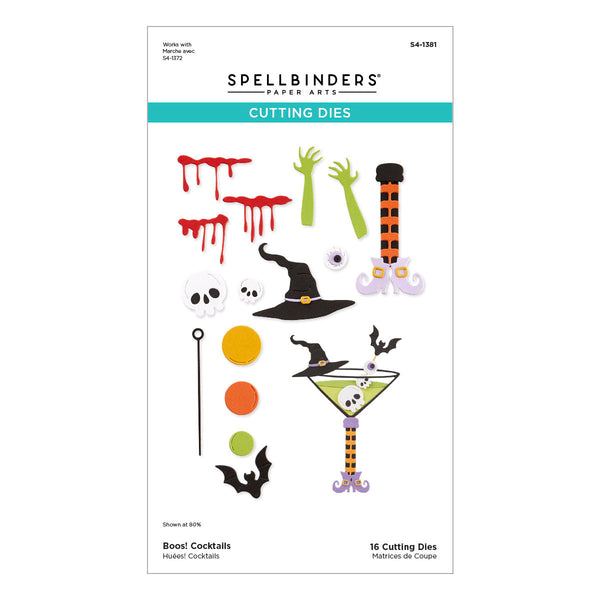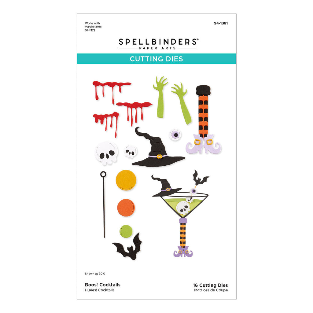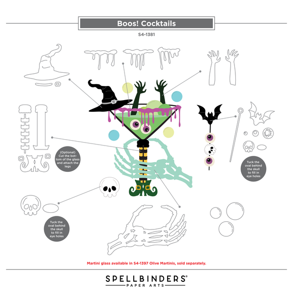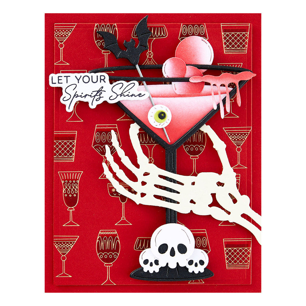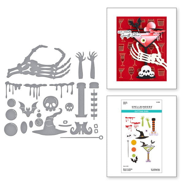 Boos! Cocktails Etched Dies are part of the Happy Hour Collection. Boo to You with this set of 16 thin metal cutting dies full of fun spooky accessories. Everything you need for a ghoulishly fun drink is included, even a Witch’s Hat! Use with S4-1372 Olive Martinis set for the glass base, or all on their own!