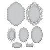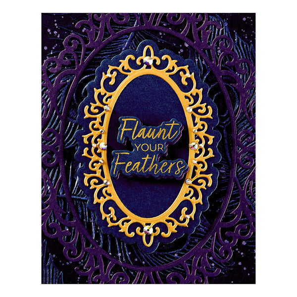 Cameo Frames Etched Dies are from the Peacock Paradise Collection by Dawn Bibby. This beautiful silhouette makes an intricate oval frame (with or without its center) and an outline for a bold look. There are two frames in this set of seven thin metal cutting dies with a label shape to hold any sentiment.