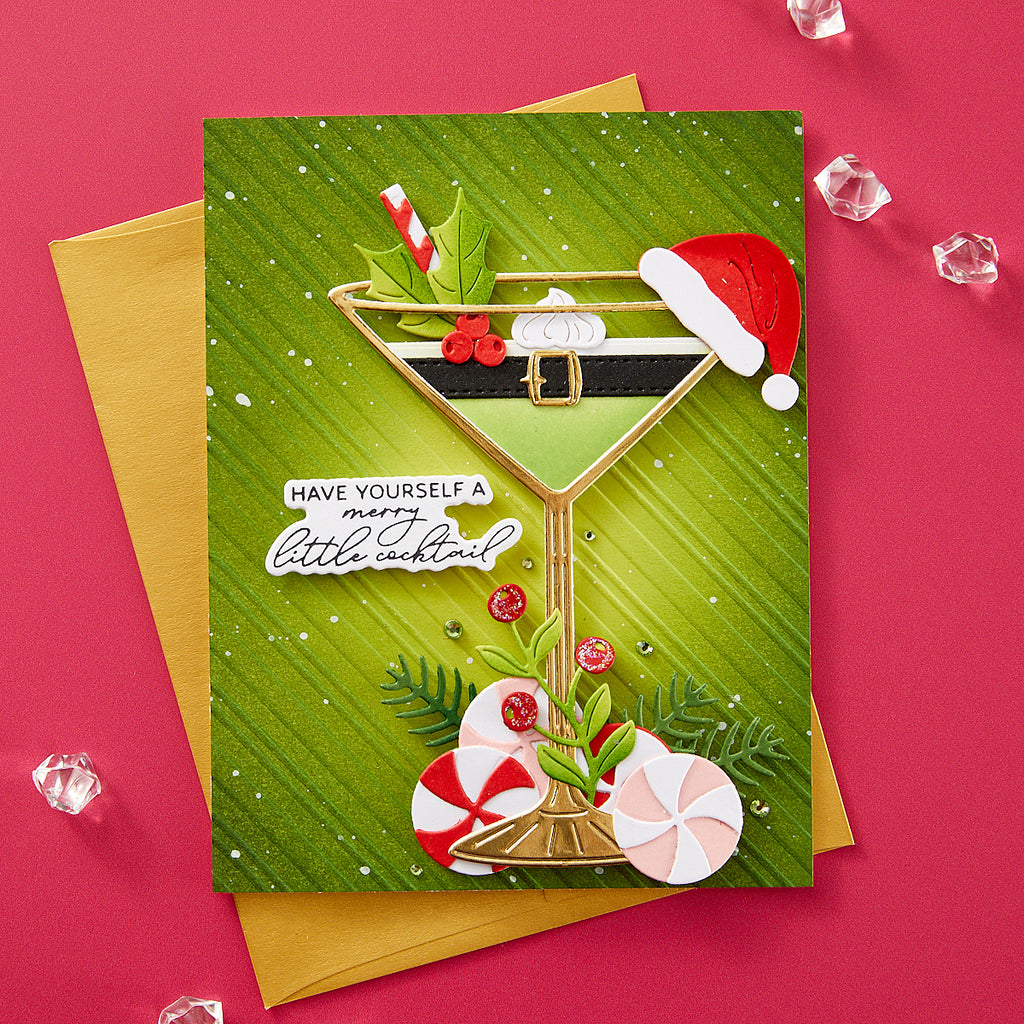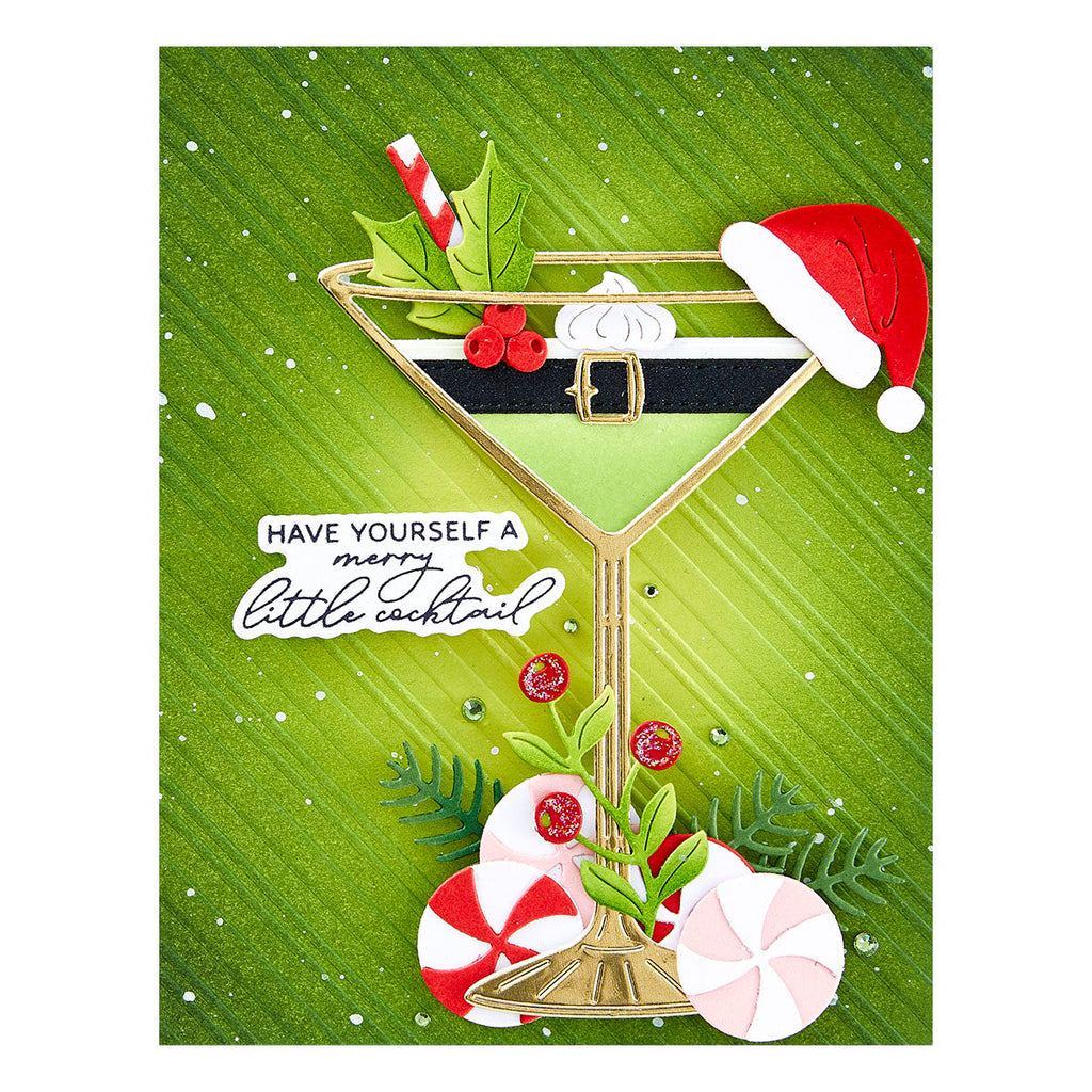 Christmas Cocktails Etched Dies are from the Happy Hour Collection. Make yourself (or a friend!) a festive cocktail like this set of 17 thin metal cutting dies. Use with S4-1372 Olive Martinis set for a wonderful glass base, or all on it's own for holiday creations.. Everything you need for a holiday drink is included, even a Santa Hat. So FUN!