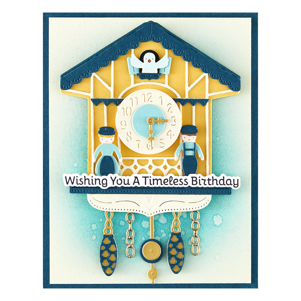Create unique and detailed cuckoo clocks with the Cuckoo Cottage Collection. The four die sets, together with the BetterPress Plate can assemble various themed clocks, complete with impressed sentiments! The interactive clock makes this a wonderful design to bring to life!