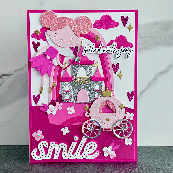 Dancin’ Fairy Twinkle Etched Dies are part of the Storytelling by Spellbinders Collection. It has a set of eight thin metal cutting dies. Isn’t this winged fairy adorable? She has her wand and also dances as her legs swing side to side. So whimsical! The Storytelling by Spellbinders Collection offers fun elements like fairies, houses, heroes to sentiments in helping to bind your story together. Mix and match the sets for many design options. What story will you tell first?