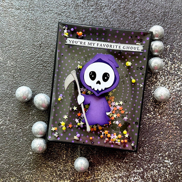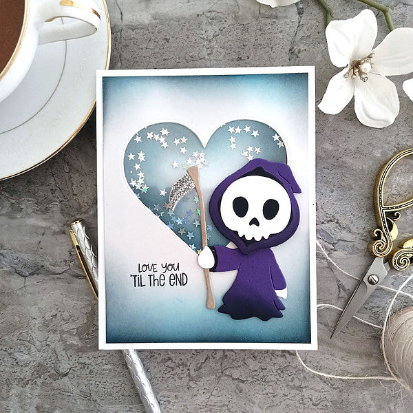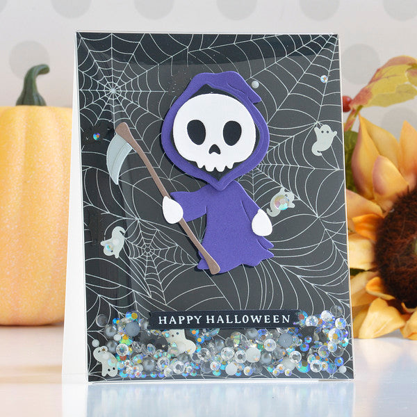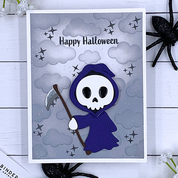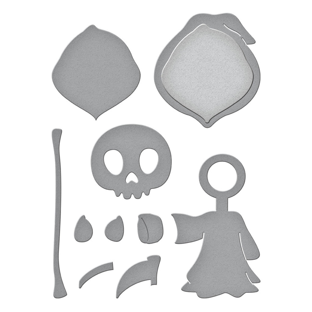 Dancin’ Grim Etched Dies are part of the Dancin’ Halloween Collection with a set of six thin metal cutting dies. When assembled, it creates this adorable ghoul. For added cuteness, it’s interactive as his robe swings back and forth! Make it a party and include S4-1308 Dancin' Day of the Dead Boy and S4-1309 Dancin' Day of the Dead Girl!