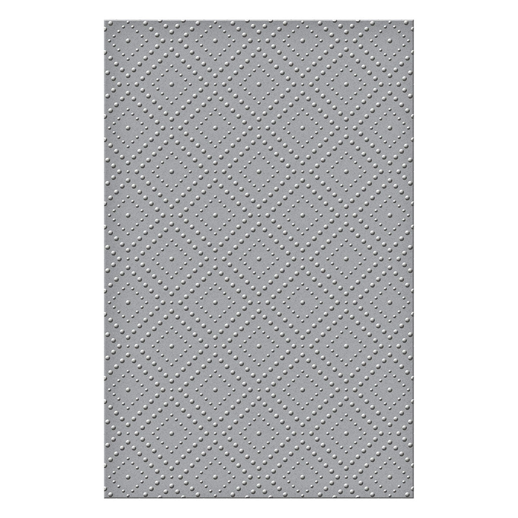 Dazzling Dots Embossing Folder is from the Celebrate the Season Collection embosses a full background design of these dotted diamonds to any card size from A2, Slimline, to A7 formats. Add texture and dimension to your surface or apply ink on one side of the folder for a letter press effect. Swipe ink across the raised embossed area to highlight its design.