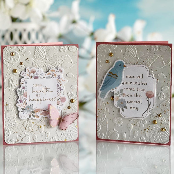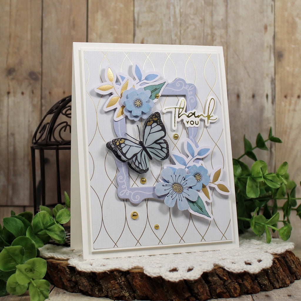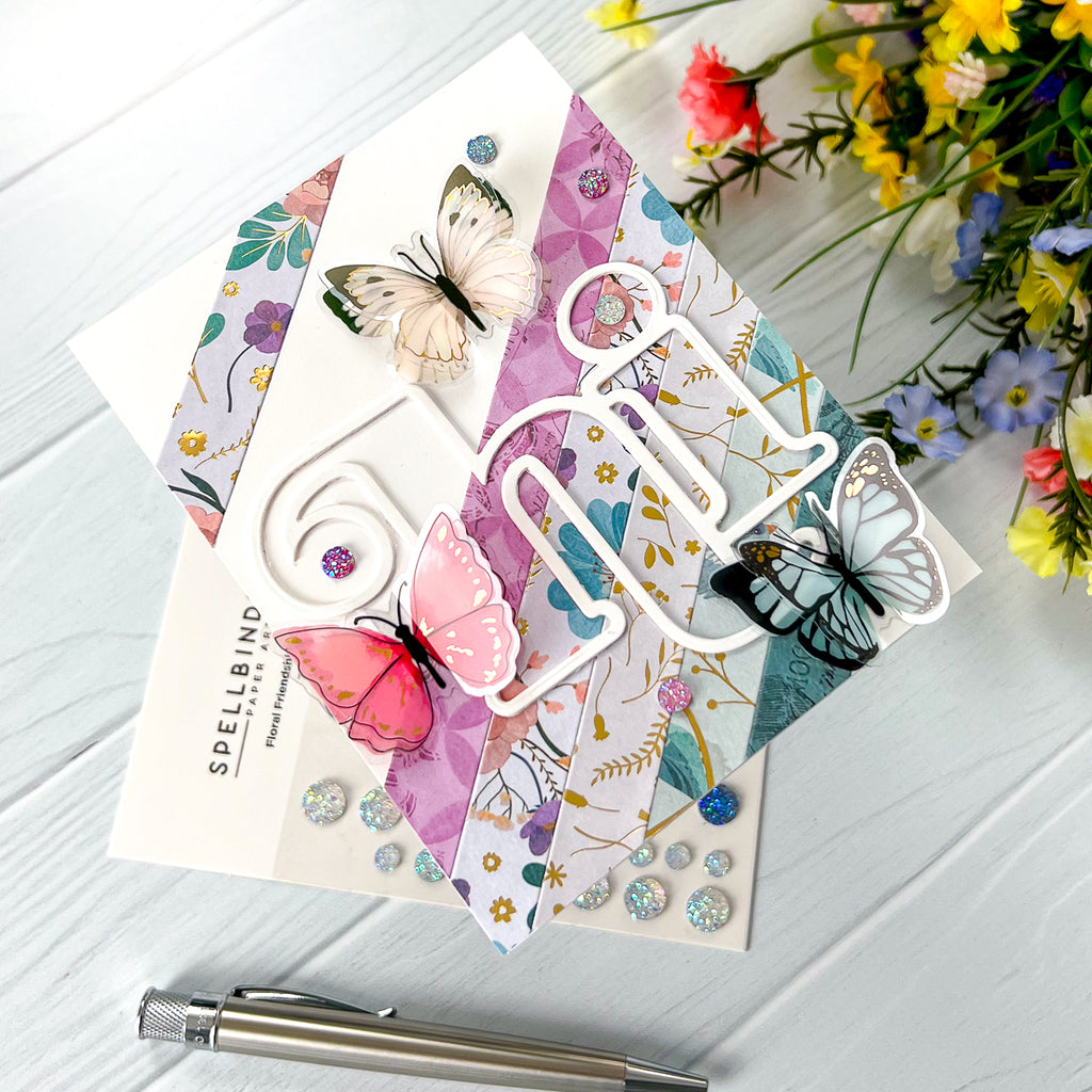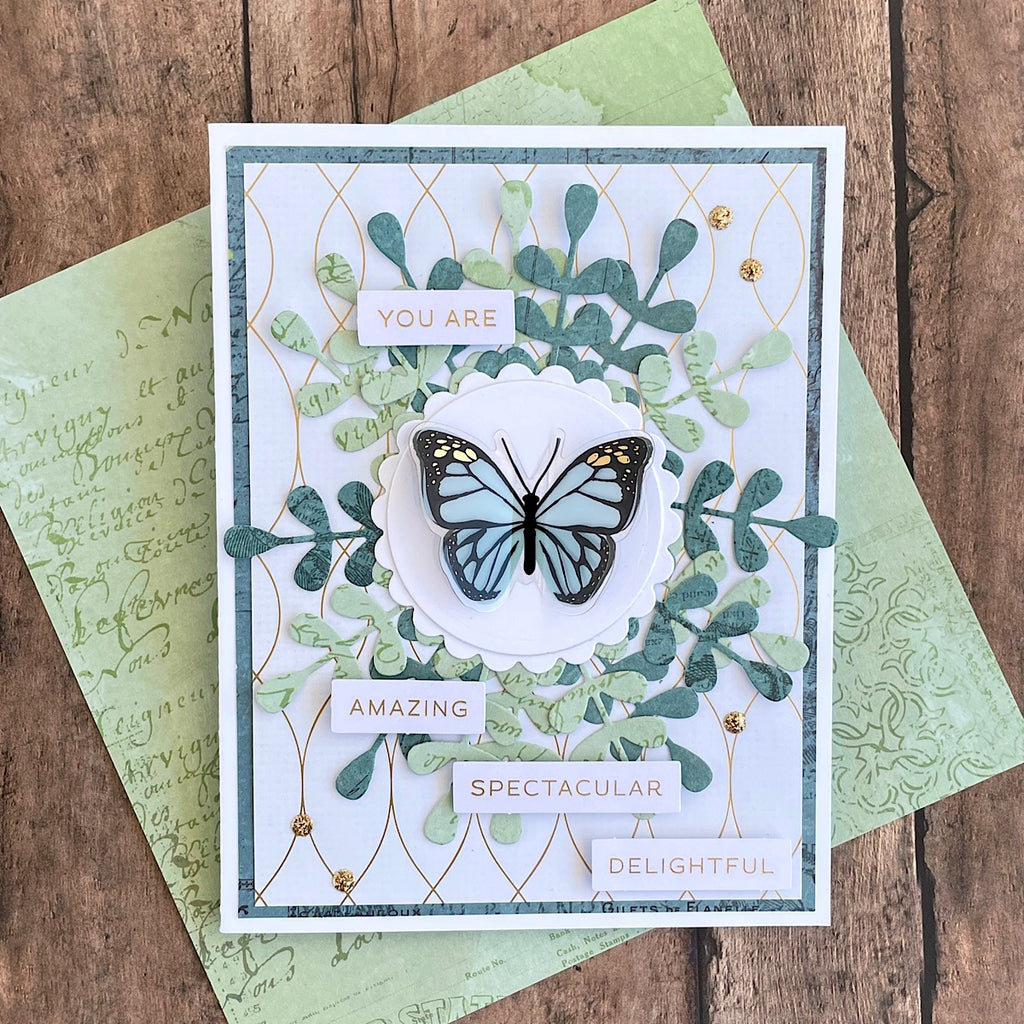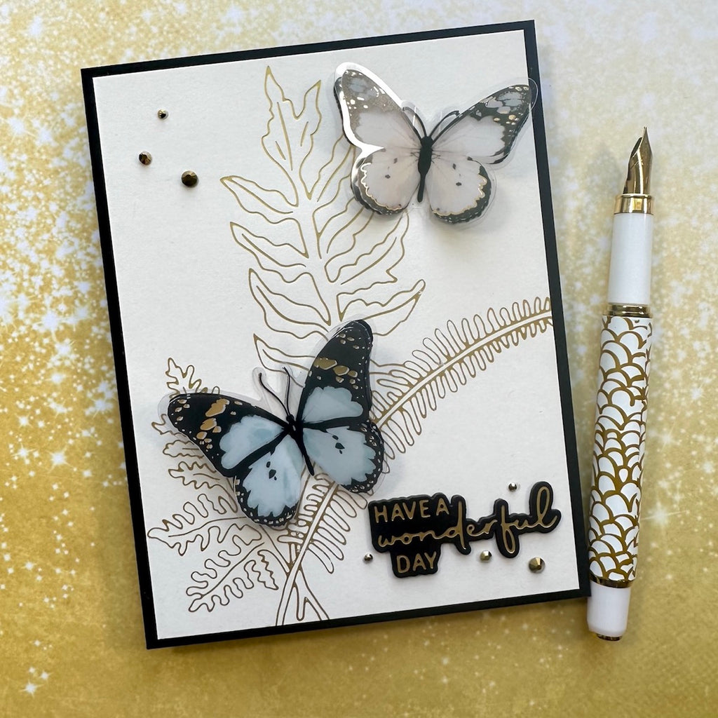 Dimensional Butterfly Stickers is a part of the Floral Friendship Collection. You'll fall in love with this set of eight adorable butterflies. They add dimension and movement to any project, and with the foil accents on the wings, even extra sparkle! Made of printed acetate, each butterfly has a flat adhesive layer and a dimensional top layer that makes the wings flutter. In soft spring pastels accented with black and gold foil, they almost seem to fly off the page!