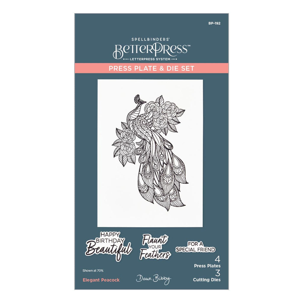 Elegant Peacock Press Plate & Die Set is from the Peacock Paradise Collection by Dawn Bibby. The largest press plate imprints a fabulous detailed peacock with floral accents on each side. Also included are three sentiment plates with matching thin metal cutting dies to pop up and highlight the greeting. Ink the plates with the BetterPress Ink to be pressed against the BetterPress Cotton Card Panel and Sheets for a crisp letterpress design.