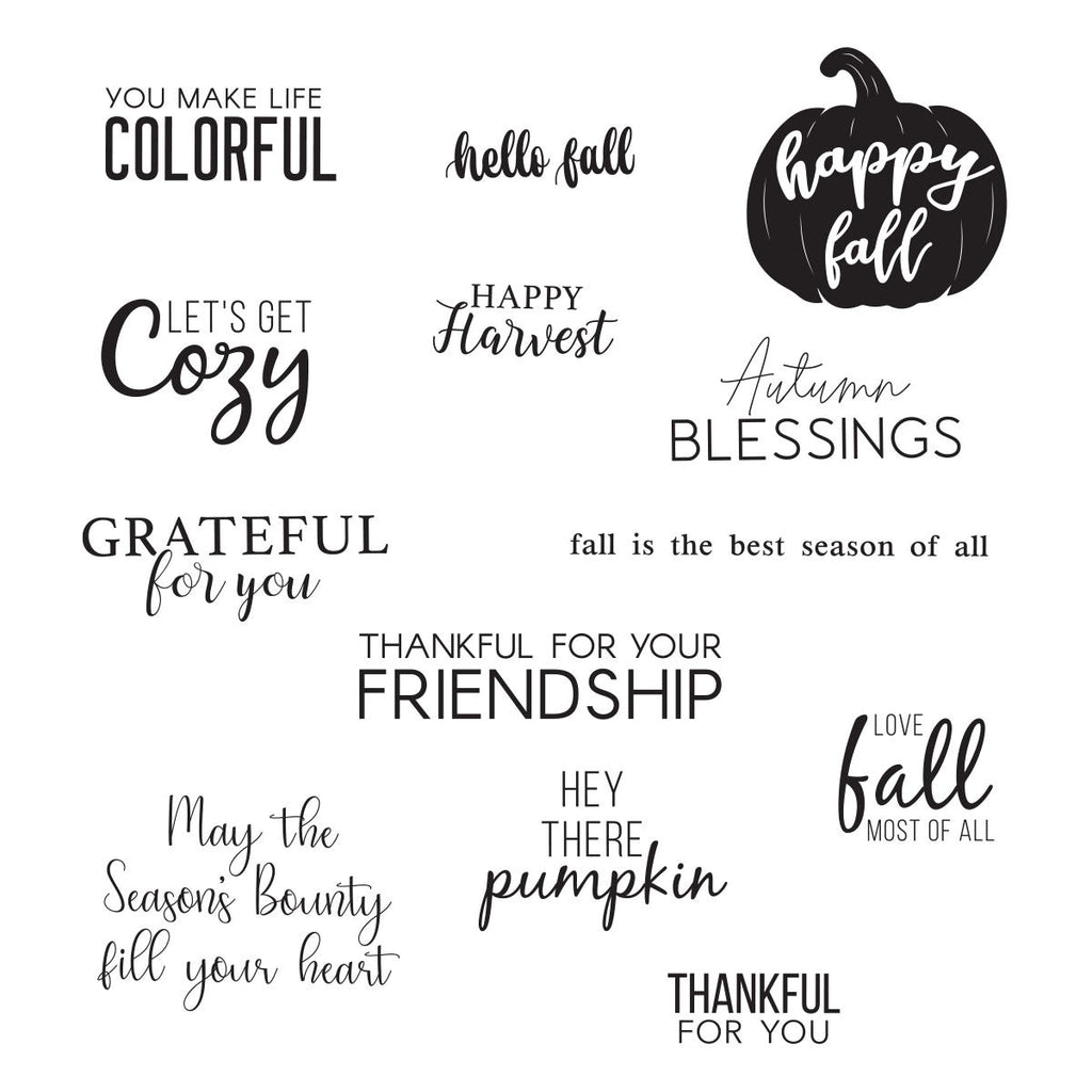 Fall Greetings Clear Stamp Set from the Happy Harvest Collection by Nichol Spohr has 13 clear polymer stamps. It includes fall-themed sentiments, along with general phrases like You Make Life Colorful, and Thankful for Your Friendship. Designed to coordinate with the Happy Harvest Collection and other fall-themed sets.