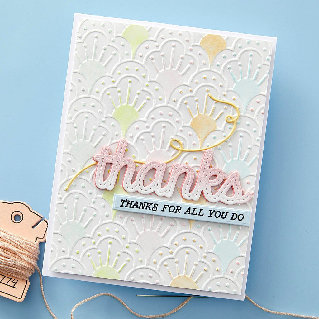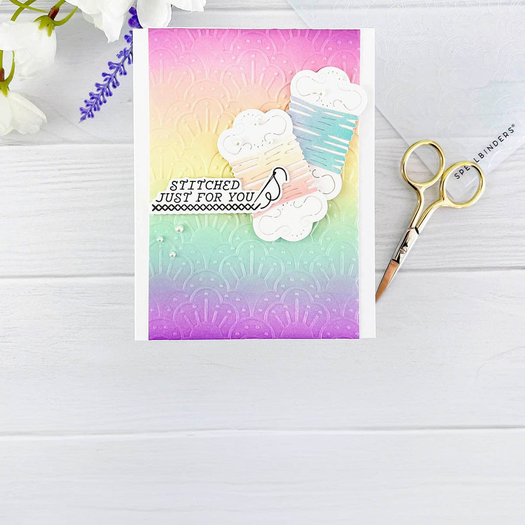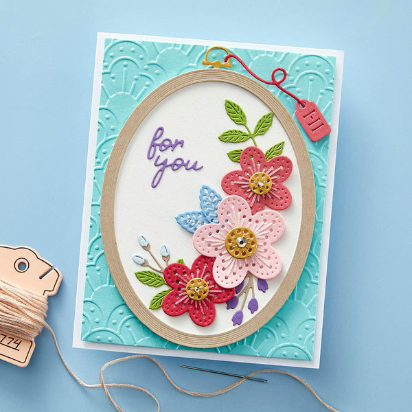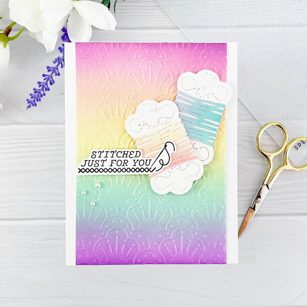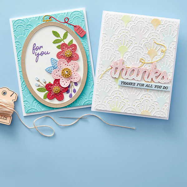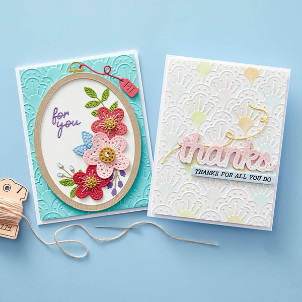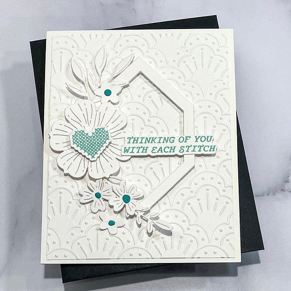 Faux Stitched Petal Embossing Folder of the Month released April 2024 to our Embossing Folder of the Month Club. This large embossing folder can make slimline, 5″ x 7″, and a variety of sized projects. Perfect for adding texture and dimension to your card projects.