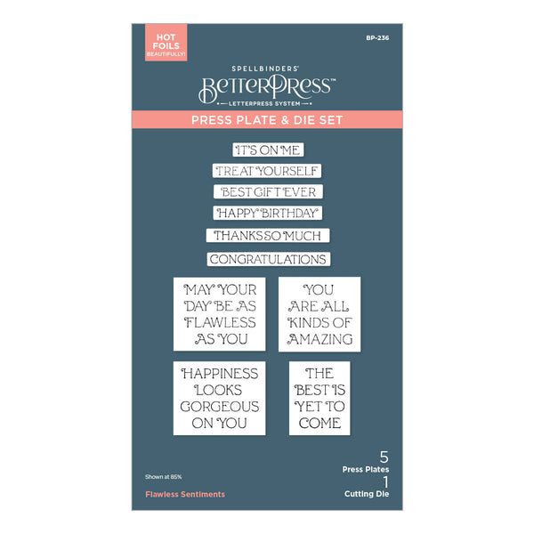Flawless Sentiments Press Plate & Die Set are part of the Gorgeous You Collection. This set of five press plates and one thin metal cutting die impresses four encouraging sentiments and a list of six short greetings. The thin metal die cuts the list of short sentiments all at once…use one, all or save the rest for later. Ink the plates with the BetterPress Ink to be pressed against the BetterPress Cotton Card Panel and Sheets for a crisp letterpress design.