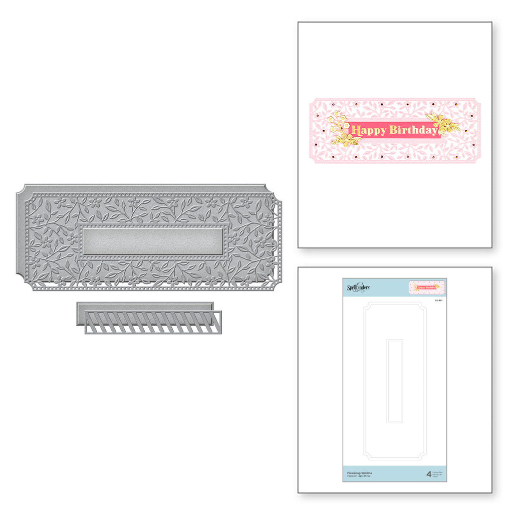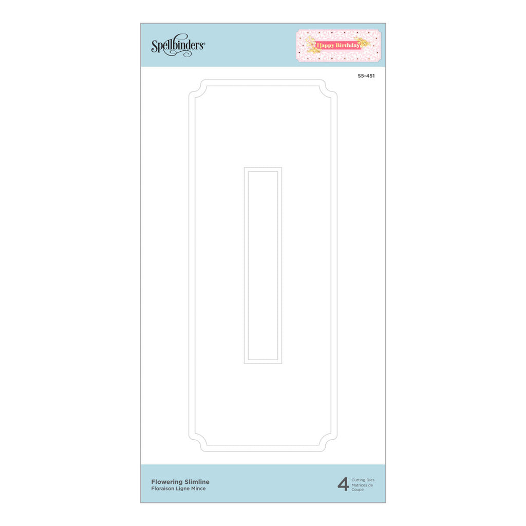 The Flowering Slimline Etched Dies is part of the Slimline Collection. This set of four thin metal dies makes a sweet intricate floral card panel with an area in the center to add a sentiment. Also included is its outer rim die and label rim with its label insert design. Fits perfectly to a Slimline style card base.