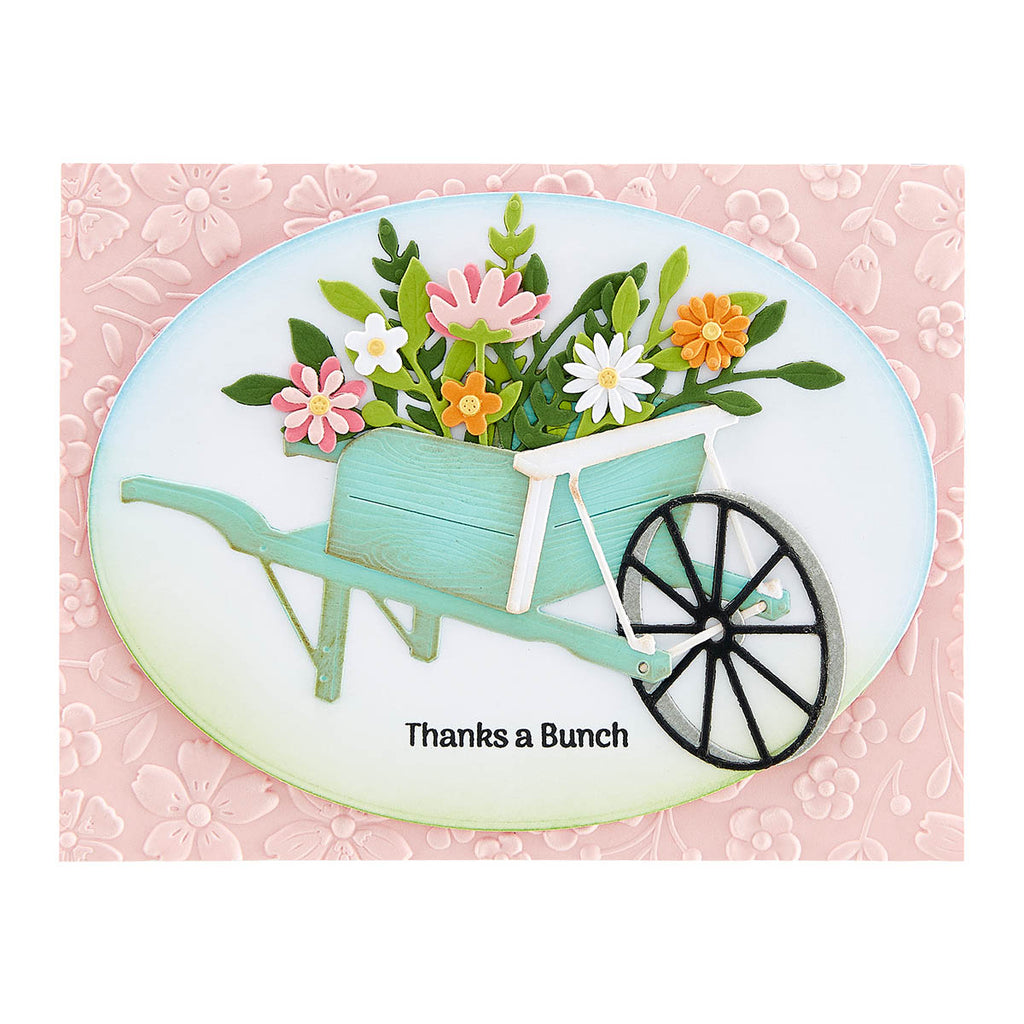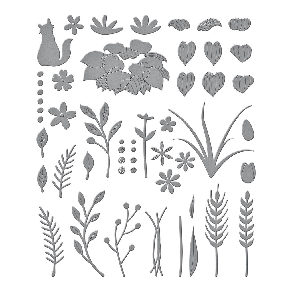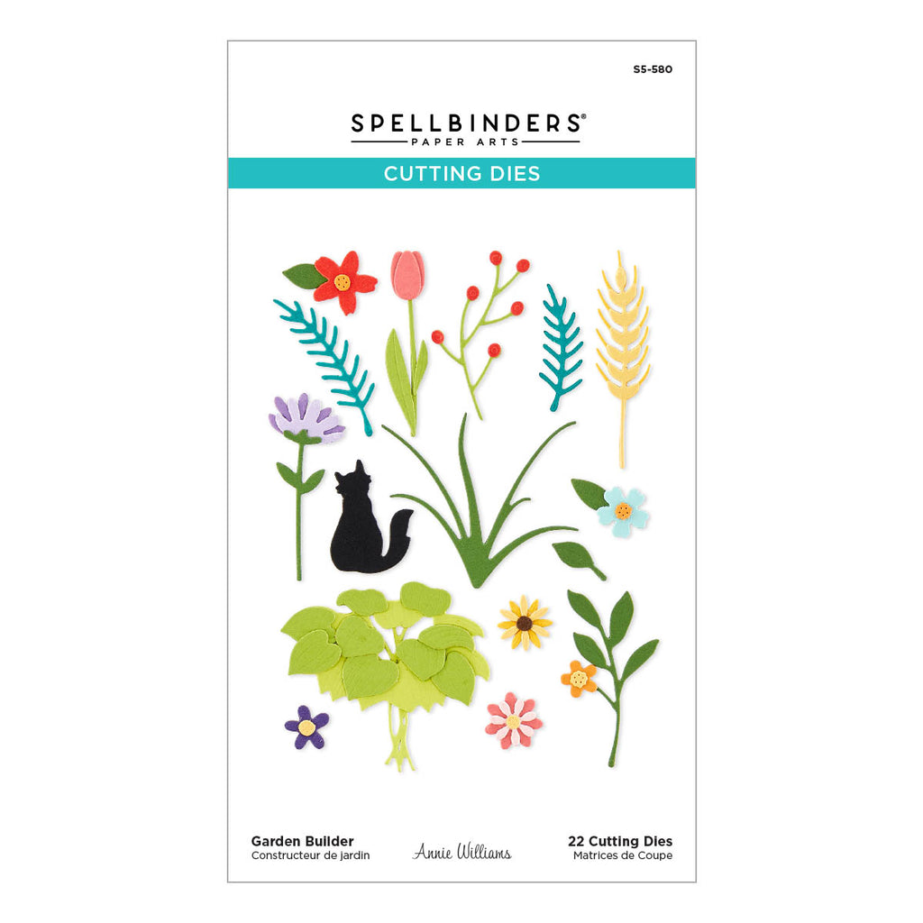 Garden Builder Etched Dies are part of the Country Road Collection by Annie Williams. This set of 22 thin metal cutting dies is full of floral motifs and can truly build a garden! What’s a garden without its companion, a sweet cat. It also makes a stunning accent for S4-1279 Country Wheelbarrow and S5-578 Rustic Garden.