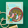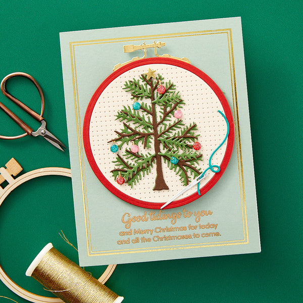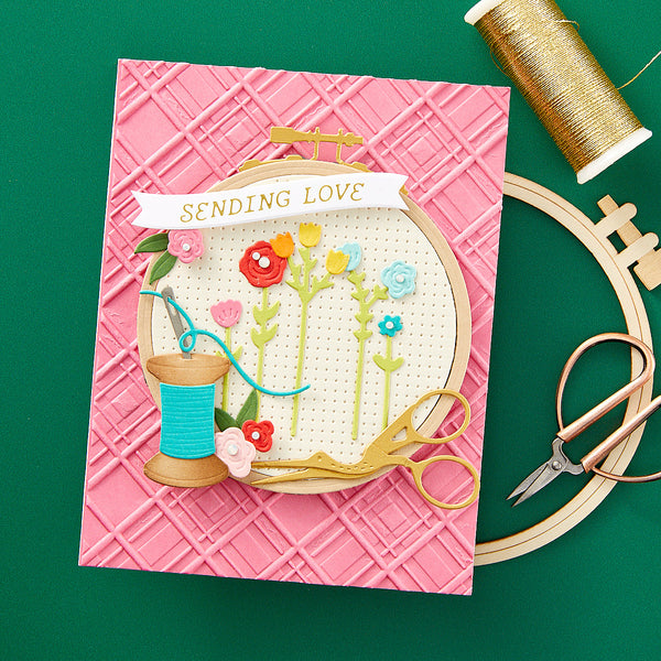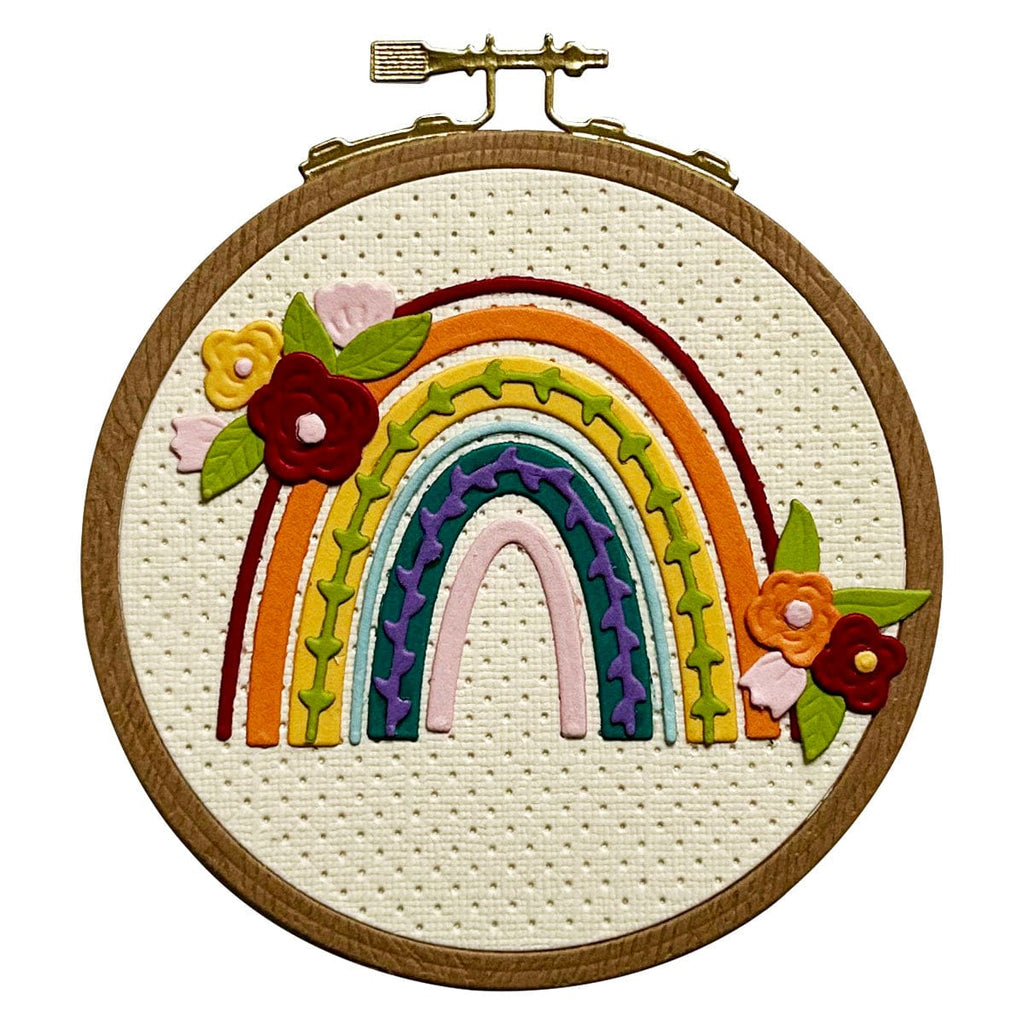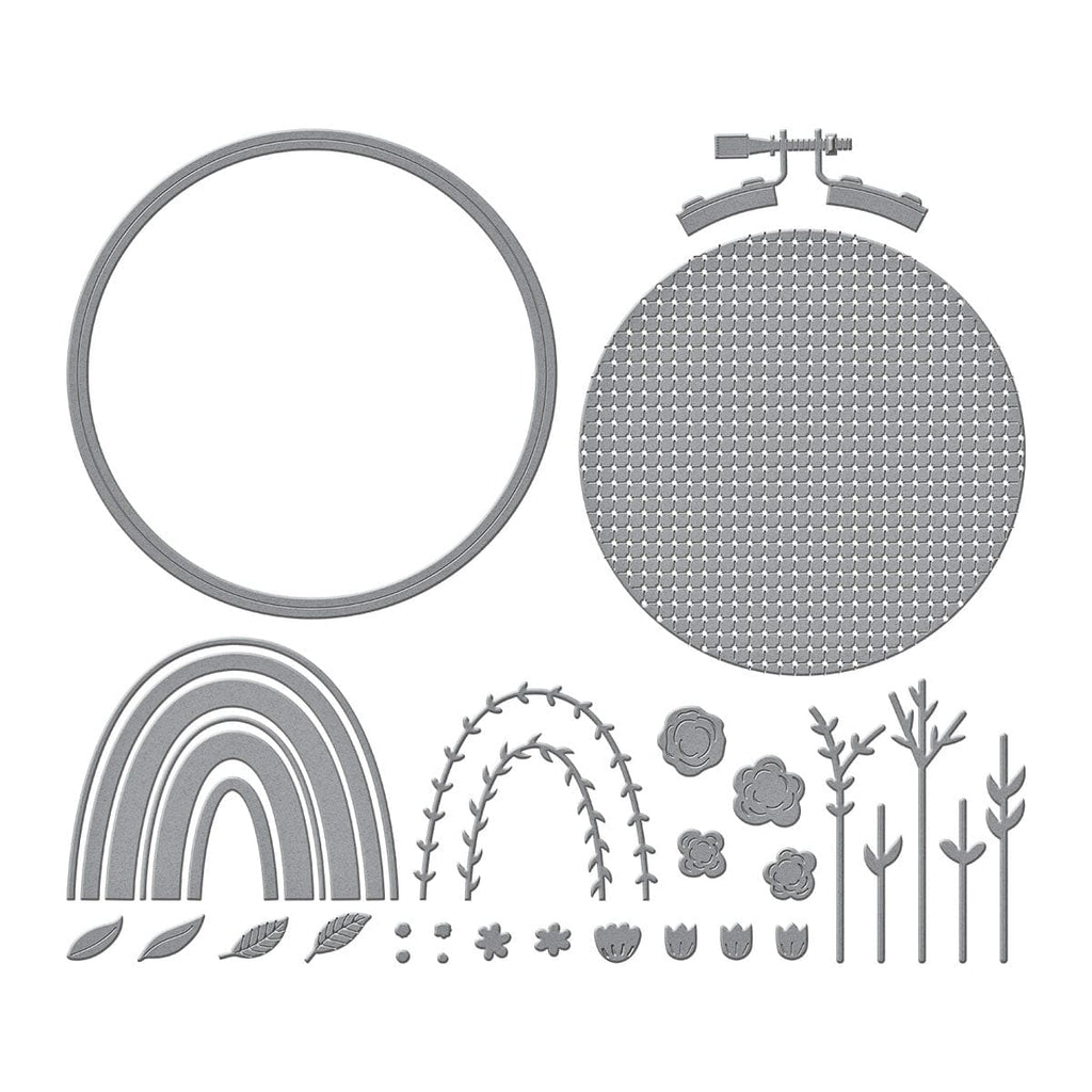 Gathering Stitches Etched Dies are part of the Nichol's Needlework Collection by Nichol Spohr. The anchor for this collection, this set of thin metal cutting dies creates a sweet embroidery hoop with a faux cross-stitch center. You'll also get a lovely design for to fill the frame, a wonderful rainbow with colored and vined arches, as well as floral accents to decorate the design. Use the pieces separately, or as a motif to fill embroidery hoop! This set is designed to be used at the base piece for the other dies in this collection, S3-519 Faux Embroidered Stockings, S4-1357 Faux Embroidered Pumpkin, and S4-1365 Faux Embroidered Spruce.