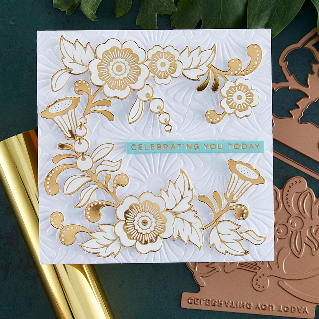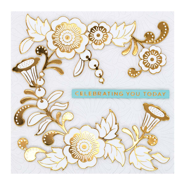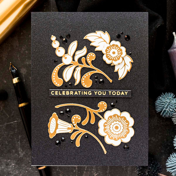 Glimmer Edge Stylized Floral - Glimmer Hot Foil Kit of the Month (Plates Only). This Glimmer Hot Foil Plate Set adds stunning foiled solid shape background and florals to cards and projects. Released November 2022 to our Glimmer Hot Foil Kit of the Month Club, it is a wonderful addition to your glimmer collection. Perfect for creating year round, all occasion greeting cards, Décor, gifts, and more! Glimmer Hot Foil Plates are designed to be used with the Spellbinders Glimmer Hot Foil System (or other compatible hot foil system). Depending on its design, some plates November be used for letterpress and embossing.