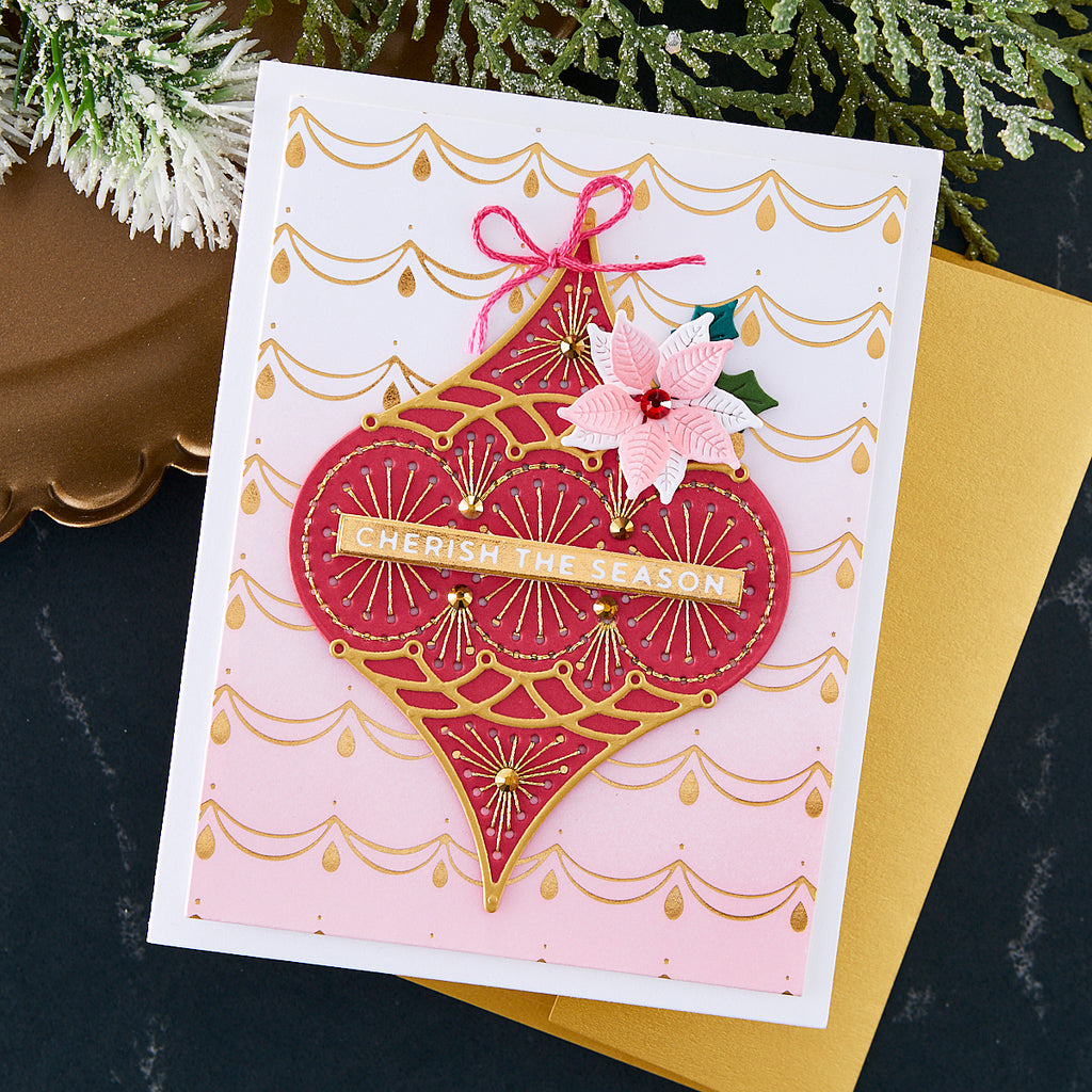 Glimmering Swag Glimmer Hot Foil Plate part of the Sealed for the Holidays Collection. This plate has a classic style background inspired by a combination of soft curve swags, tear drops and circle designs. The repeat pattern provides an elegant backdrop for any card creation and more!