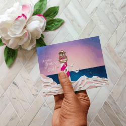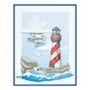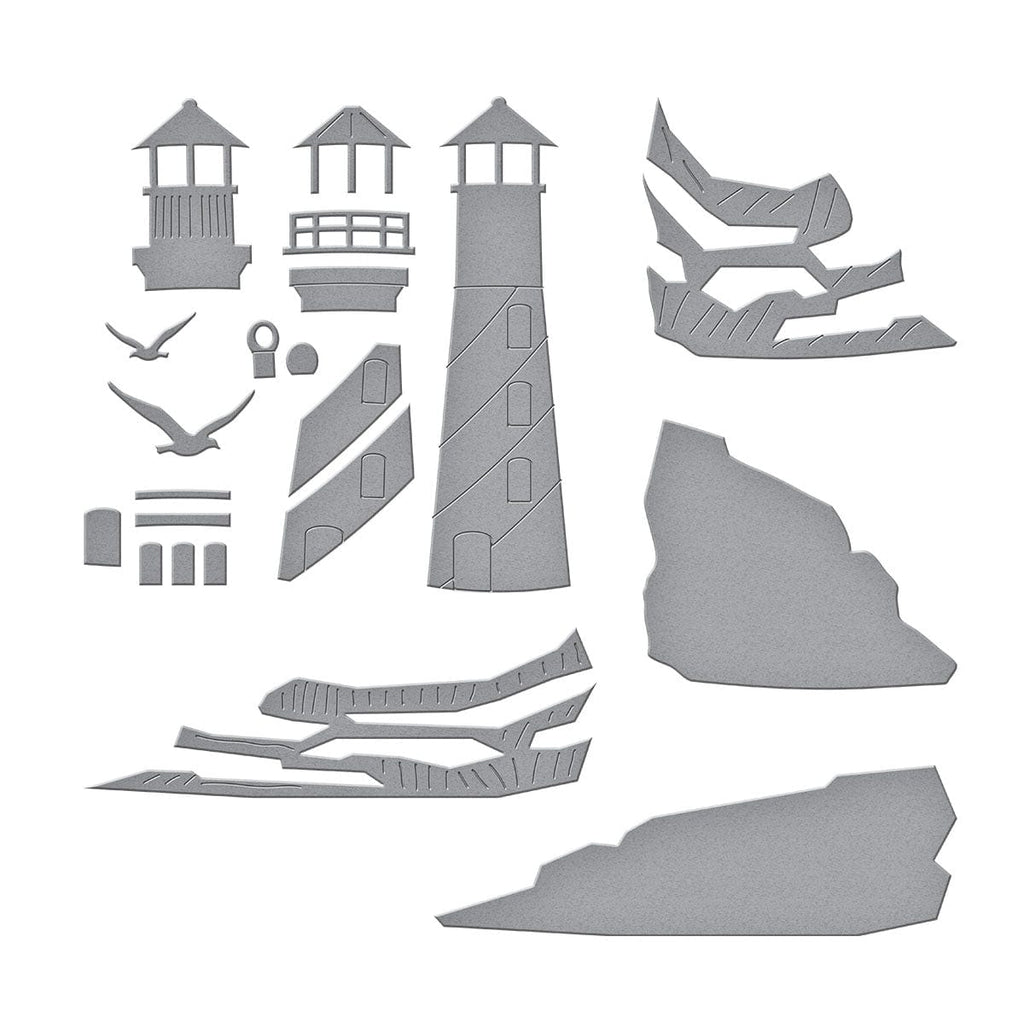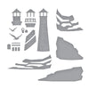Guiding Light Etched Dies are part of the Fair Winds Collection by Dawn Woleslagle. Perfect for setting a coastal scene, this set of twelve thin metal cutting dies create a noble lighthouse standing tall on a rocky shore. With two different embossed rock bases, the lighthouse can stand tall no matter the type of coast line. Also included are two seagull silhouettes to adorn the sky. Combine with S5-633 Set Sail Etched Dies for waves and clouds to complete the scene.