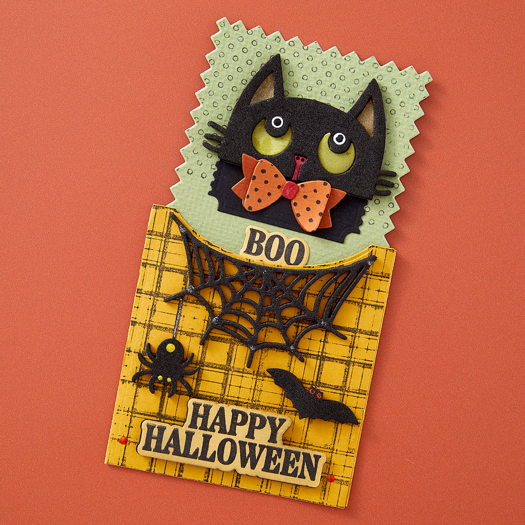 Halloween Add-Ons Stamp & Die Set is part of the Not Your Ordinary Card Collection by Wendy Vecchi with a set of three clear stamps and twenty thin metal cutting dies. With a peekaboo kitty, a ticket, a star and a wrapped candy, many elements of this set can be used all year round. Or, go for sweet and spooky by adding in the spider web, bat, spider and candy corn for Halloween fun! Also included are three stamp sentiments and the coordinating dies: Oct 31, Boo, and Happy Halloween. Designed to coordinate with S6-224 Gifting Envelope, this set is ideal for creating a sweet treat holder or a great spot for a gift card.