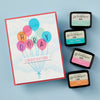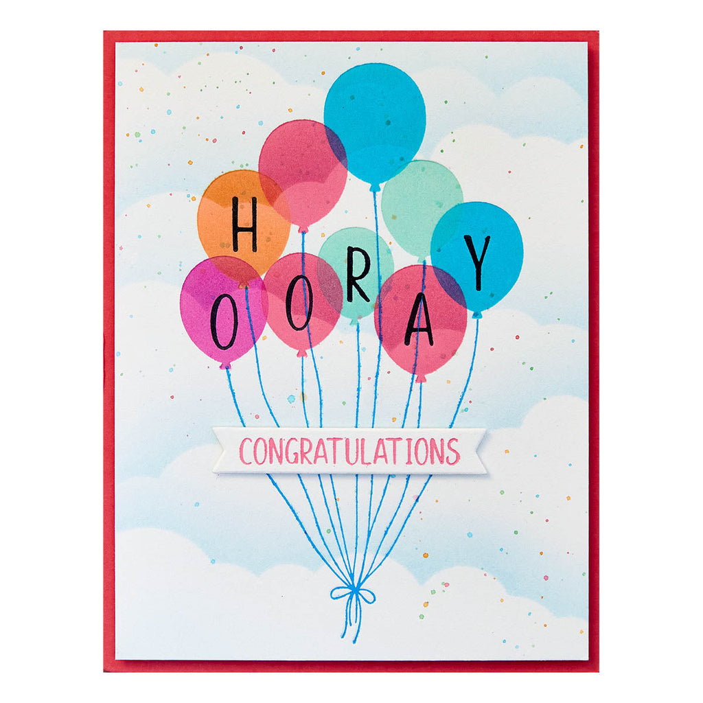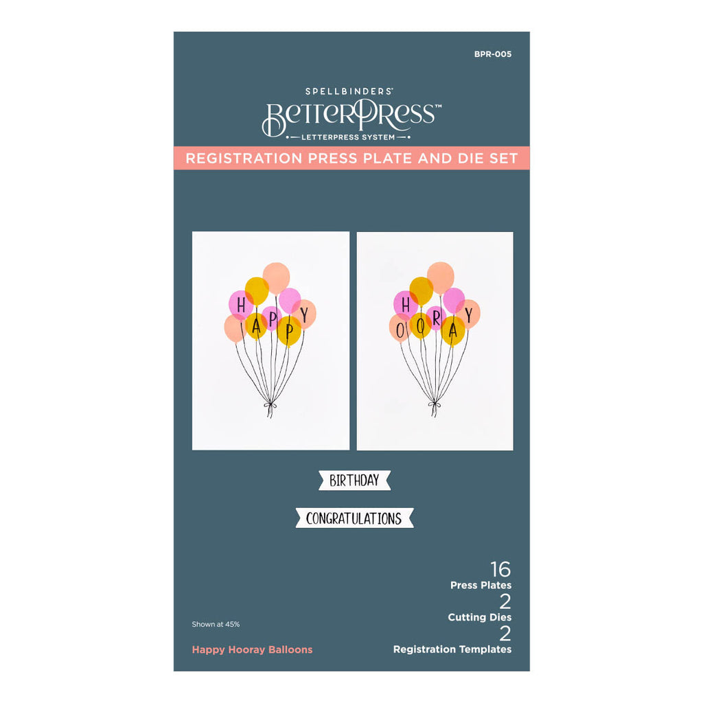 Happy Hooray Balloons Registration Press Plate & Die Set are from the Cheers to You Collection. The set of 16 press plates, two thin metal cutting dies and two mylar printed registration templates come together to create a multi-color balloon cluster focal point. Add in words, 'Happy' or 'Hooray,' inside the balloons to personalize your projects!