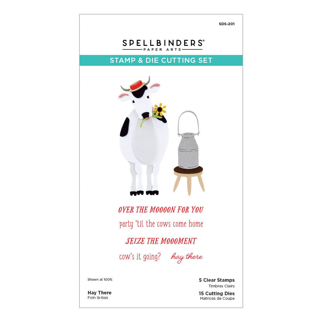 Hay There Clear Stamp & Die Set is from the On the Farm Collection. This adorable set of 15 thin metal cutting dies creates a cow with a hat and flowers, along with a milk can and stool. Add in the four punny clear stamp phrases included in this set and cards come together in a flash with the perfect matching sentiment. Stamps include: Party 'til the Cows Come Home, Seize the Moooment, Cow's It Going?, Hay There, and Over the Mooon for You. Assembled Cow measures approximately 1.58 x 3.51 in./4.00 x 8.90 cm, assembled Milk Can measures 0.66 x 1.59 in./1.70 x 4.00 cm, and assembled Stool measures 0.92 x 0.89 in./2.30 x 2.30 cm.