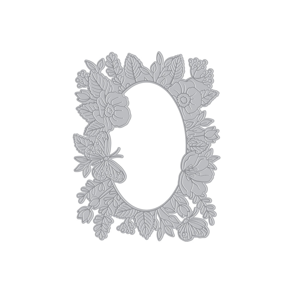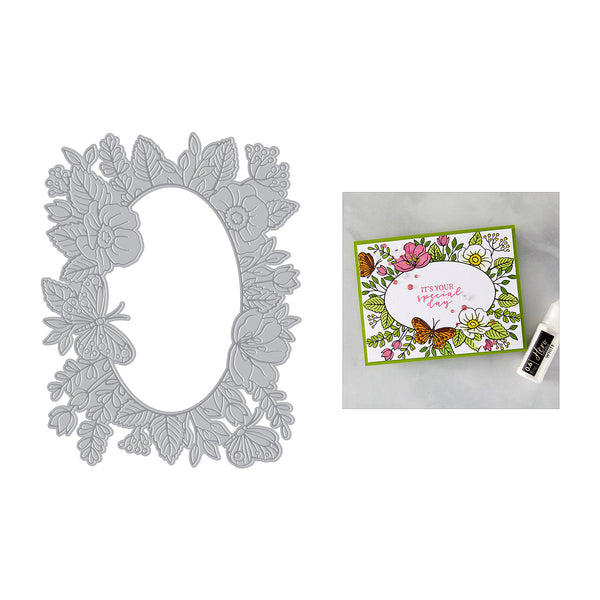 Floral Frame Letterpress + Foil Plate from the Lovely LetterPress Collection The Floral Frame BetterPress & Foil Plate is from the Lovely LetterPress Collection. This A2 sized plate fills an entire cardfront with a sweet spray of greenery and florals, with an elegant butterfly perched on the frame. The center of the plate is open, perfect for adding a sentiment or additional decorative element. Cards are so easy and impressive with this quick one-and-done plate!