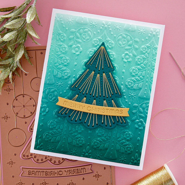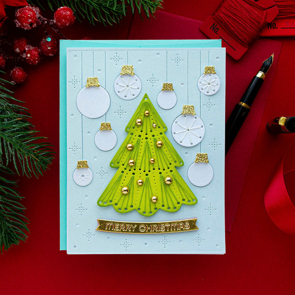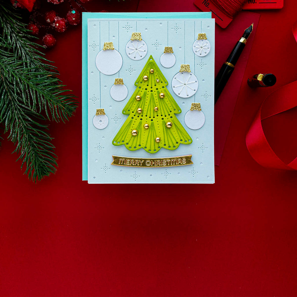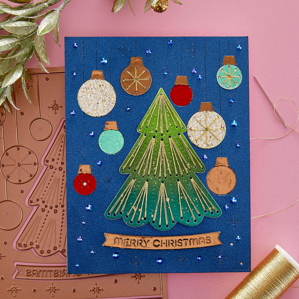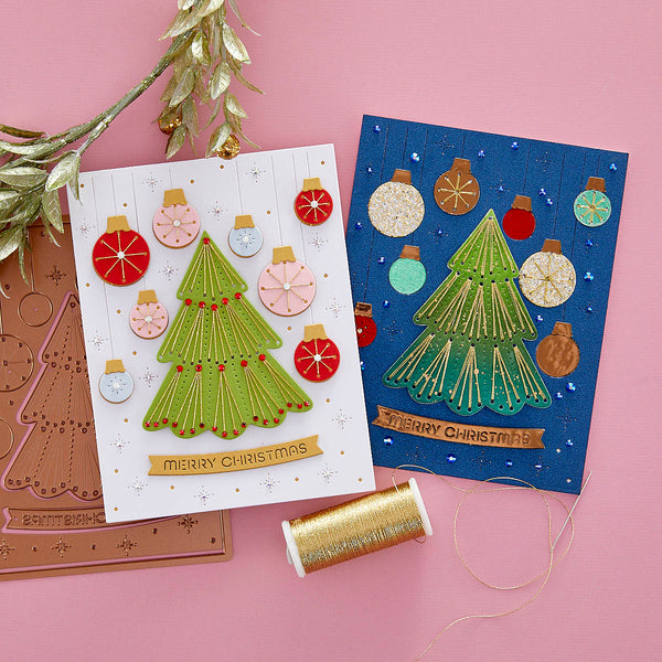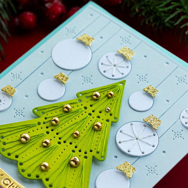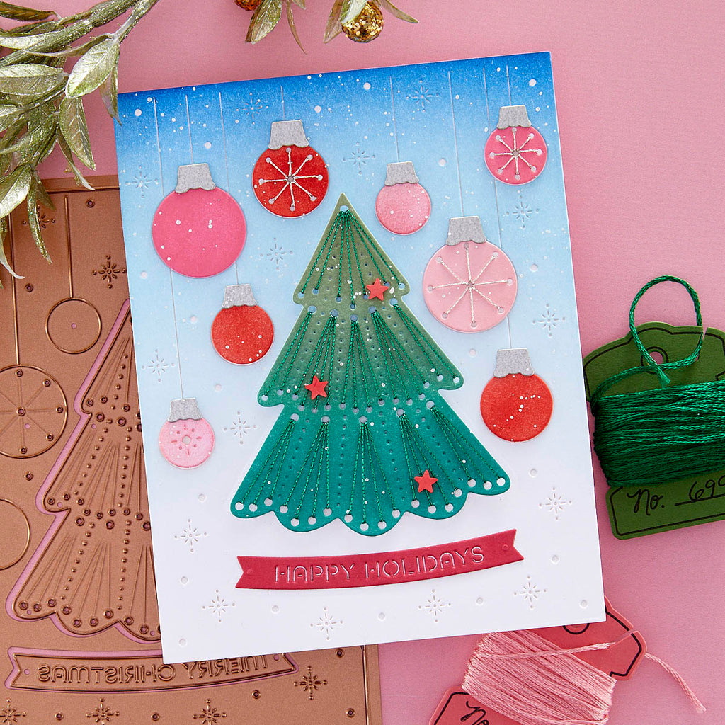 I'll Be Home For Christmas- Stitching Die of the Month Die this 7-piece die set released October 2023 to our Stitching Die of the Month Club creates a super cute Christmas Tree and ornaments. Use to create cards, décor, gift card holder, gifts, and more! Add stitching to have even more textures in crafts.